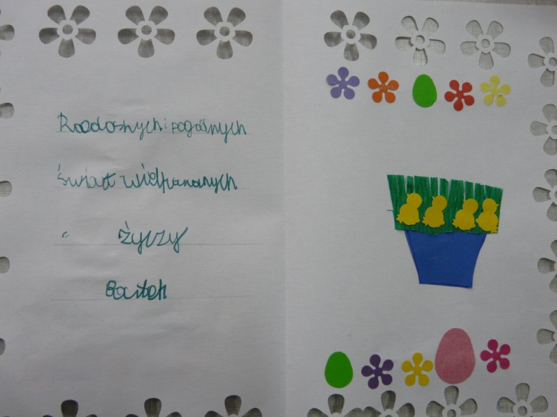 Do Ośrodka zawitała wiosna barwiąc wszystko wokół paletą najpiękniejszych kolorów. Coraz śmielej rozkwitają pączki na drzewach, trawa zieleni się soczyście, zewsząd rozbrzmiewa ptasie trele. Wszystko przenika zapach kwitnących ziół i kwiatów. „Pęcznieją sady i żywicą pachnie las…” Słoneczna pogoda udziela się naszym wychowankom, którzy coraz częściej goszczą na świeżym powietrzu. Dzieci ciągną nauczycieli do parku i na plac zabaw, gdzie szczęśliwe hasają pośród kolorowych drzew. Starsi uczniowie pomagają w wiosennych pracach w ogrodzie, troszcząc się o parkowe ścieżki, skalniaki, krzewy i kwiaty. Gdy wokół wszystko budzi się do życia, w klasach i świetlicach trwają wielkanocne przygotowania. Uczniowie malują tradycyjne pisanki, wykonują świąteczne kartki, ozdabiają ścienne dekoracje. Poznają także świąteczne obrzędy, tradycje i zwyczaje. W szkole i w internacie panuje wspaniała wiosenna atmosfera, inspirowana radością zbliżających się świąt.