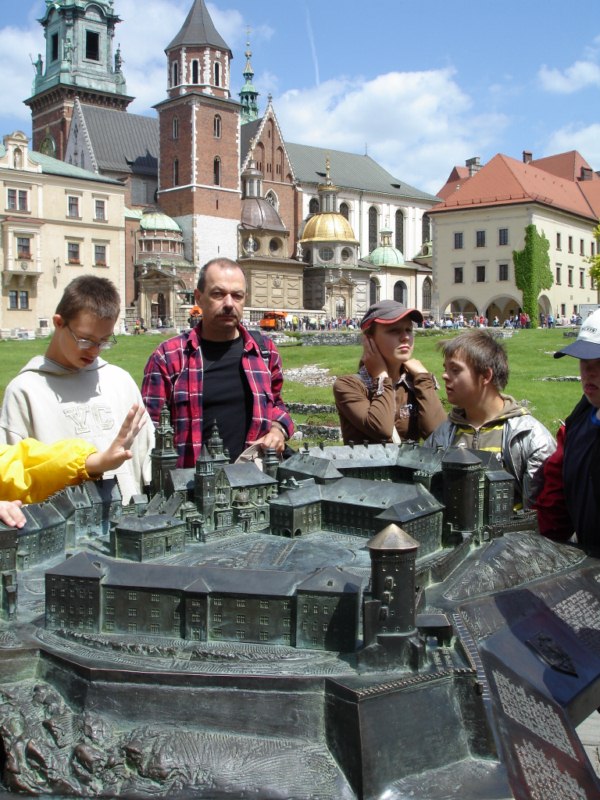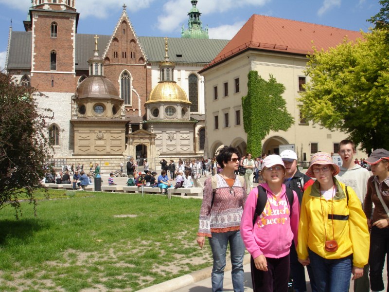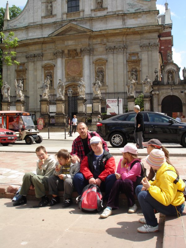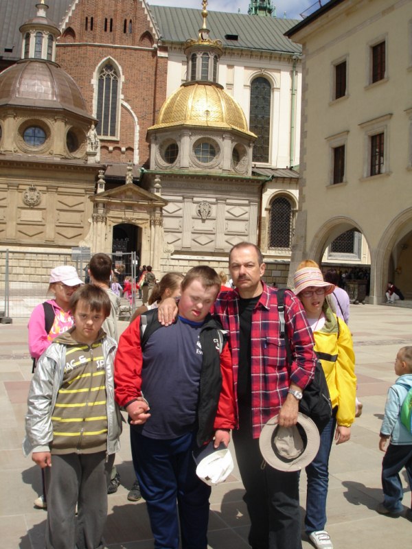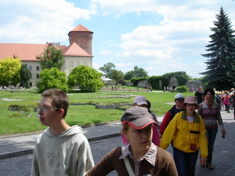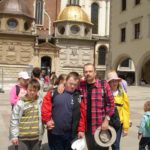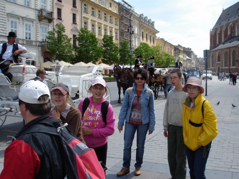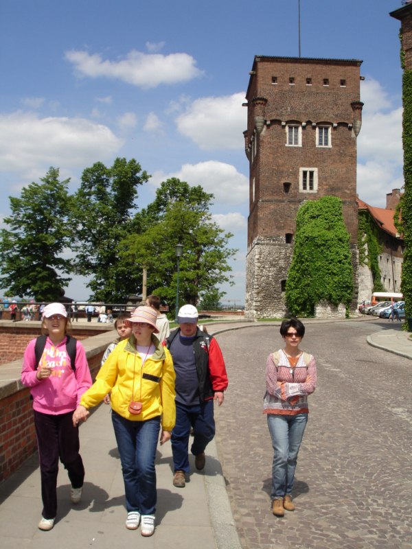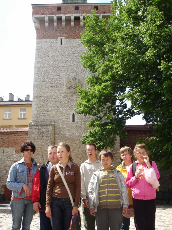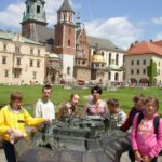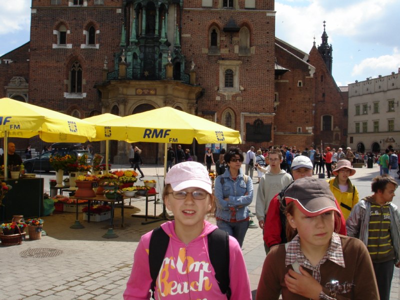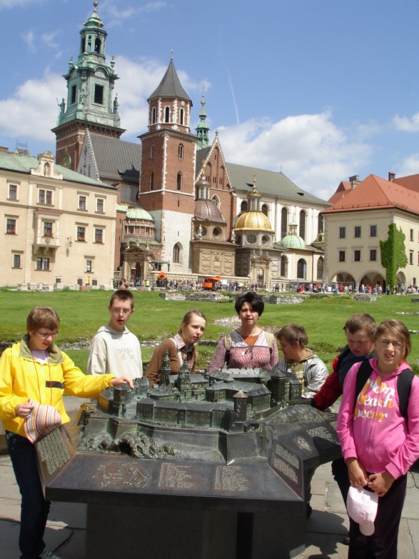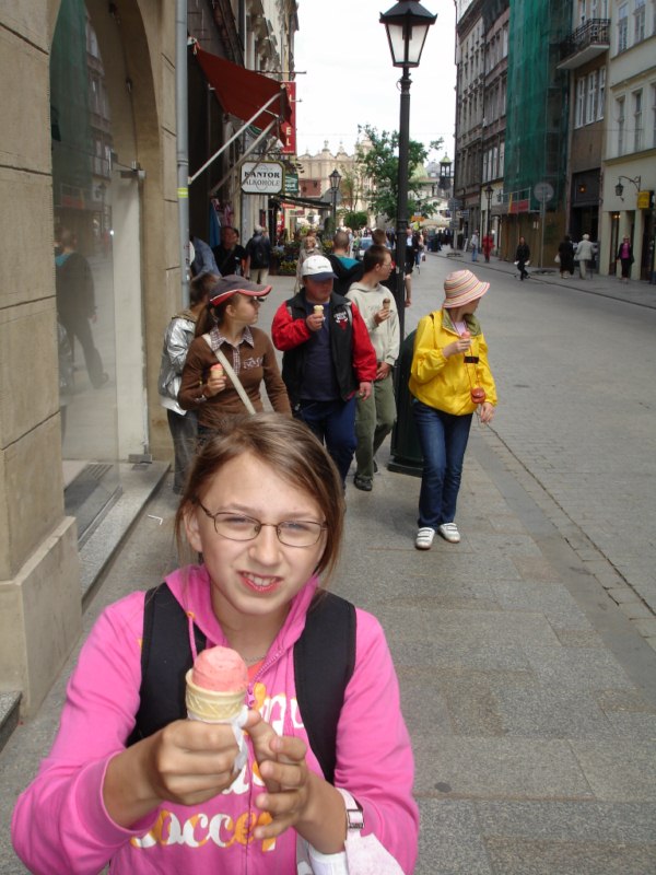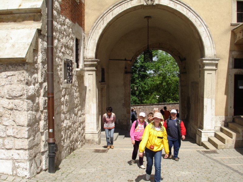 Zwiedzanie rozpoczęliśmy od kościoła św. Floriana przy Placu Matejki. Następnie zatrzymaliśmy się pod pomnikiem Grunwaldzkim. Przechodząc obok Barbakanu i resztek dawnych fortyfikacji miejskich, poprzez główną bramę wjazdową wkroczyliśmy w obręb Starego Miasta. Dalej ulicą Floriańską udaliśmy się na największy plac średniowiecznej Europy – Rynek. Tutaj zwiedzaliśmy Kościół Mariacki, Sukiennice, pomnik Adama Mickiewicza. Mieliśmy możliwość wysłuchania hejnału z wieży kościoła Mariackiego. Dużą atrakcją i zainteresowaniem wśród dzieci cieszyły się dorożki konne. Kontynuując spacer ulicą Grodzką podziwialiśmy kościół św. Piotra i Pawła z postaciami Apostołów na postumentach oraz pomnik ks. Piotra Skargi. Przyszedł także czas na chwilę odpoczynku i na coś co zaczyna się na literkę ,,L” jak lody. Każdy miał możliwość wybrać swój ulubiony smak: truskawka, czekolada, marakuja, pomarańcz itp.. Schłodzeni niebiańskimi smakami przeszliśmy ulicą Kanoniczną na Wzgórze Wawelskie do najwspanialszej rezydencji renesansowej w Europie. W drodze powrotnej był czas na zakup pamiątek i posiłek w McDonald.