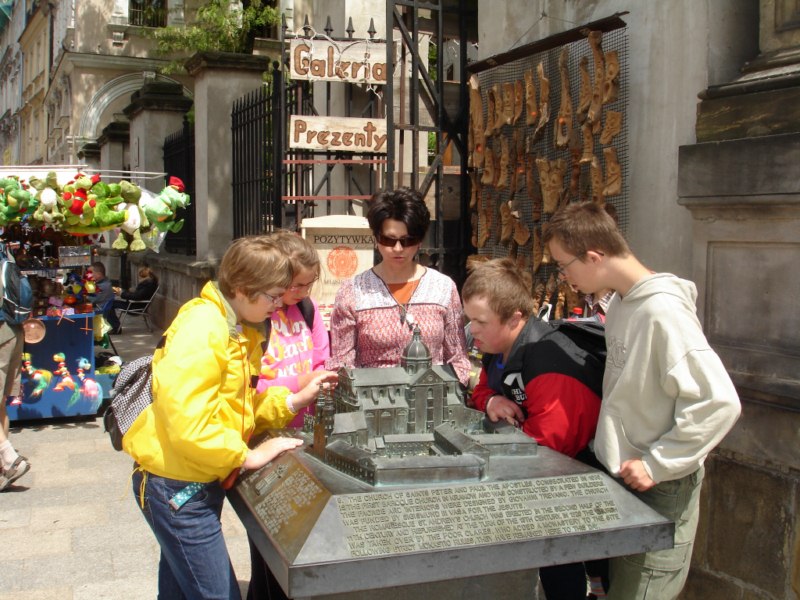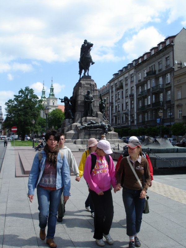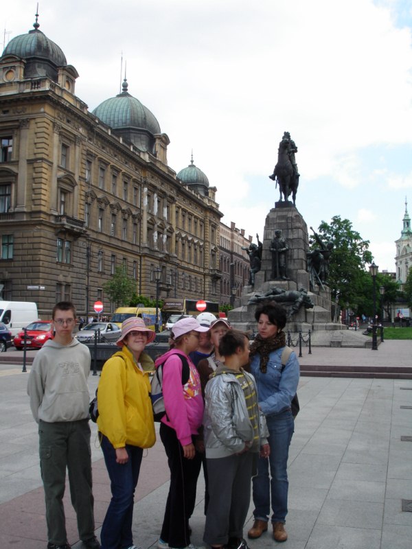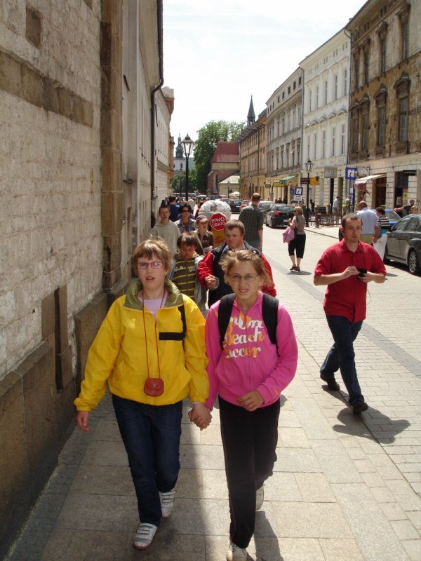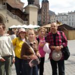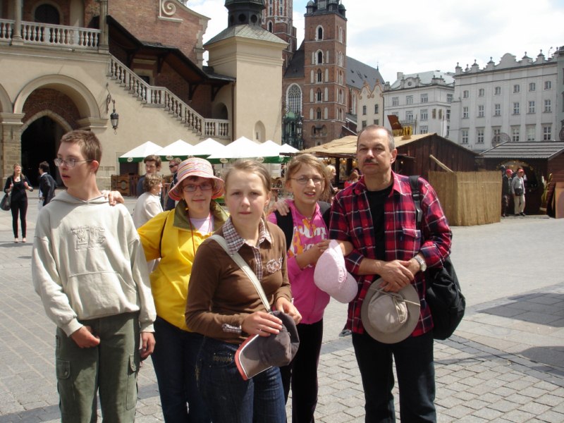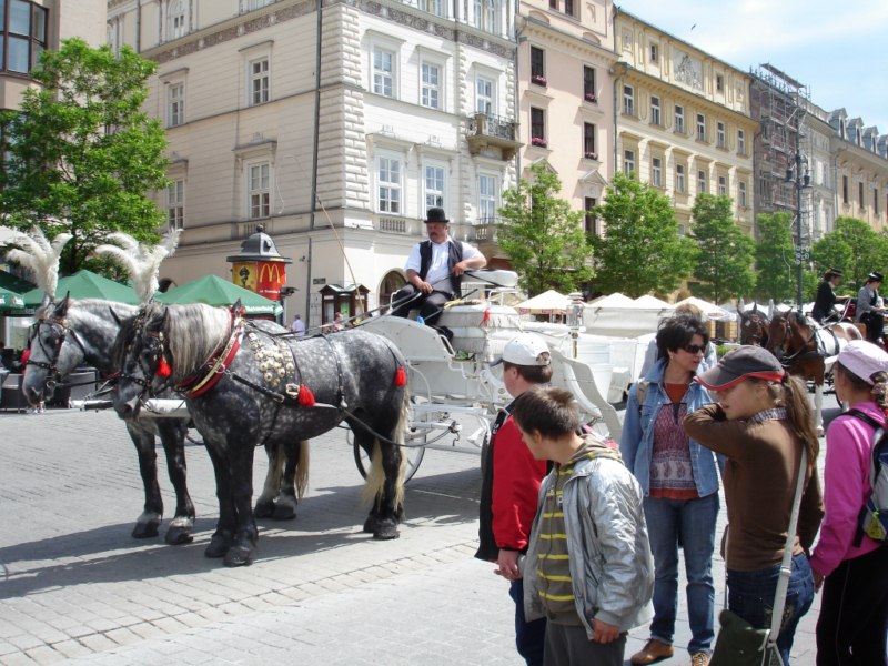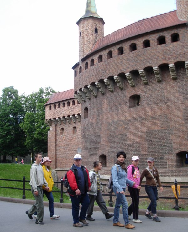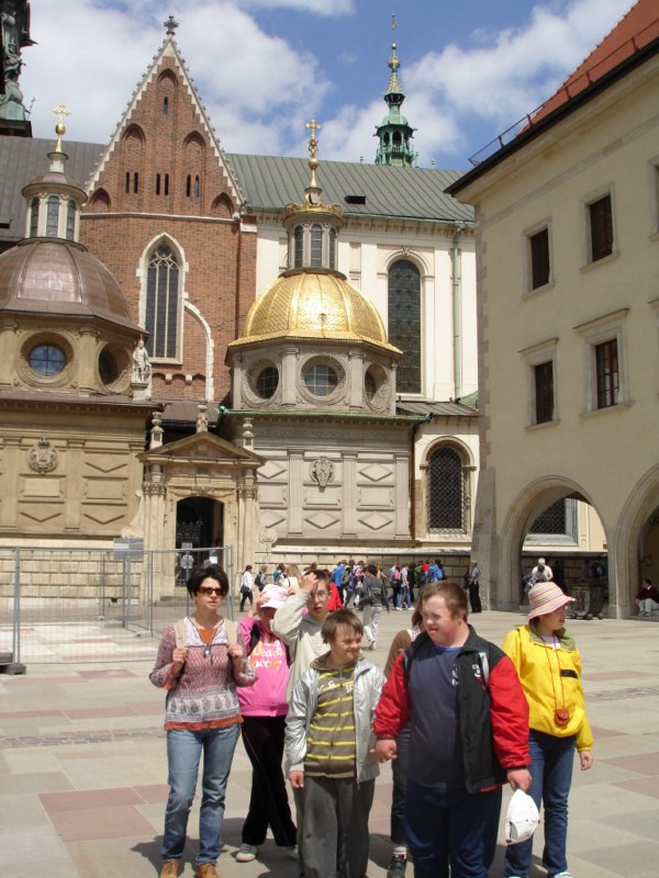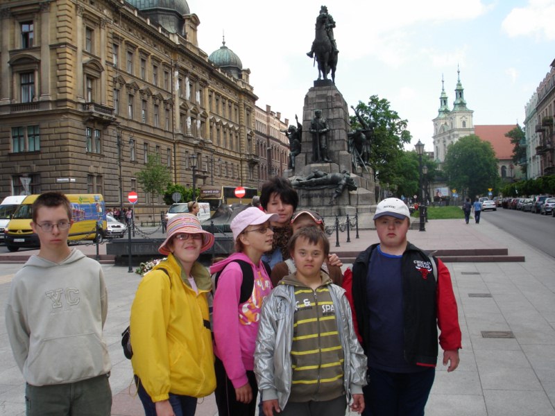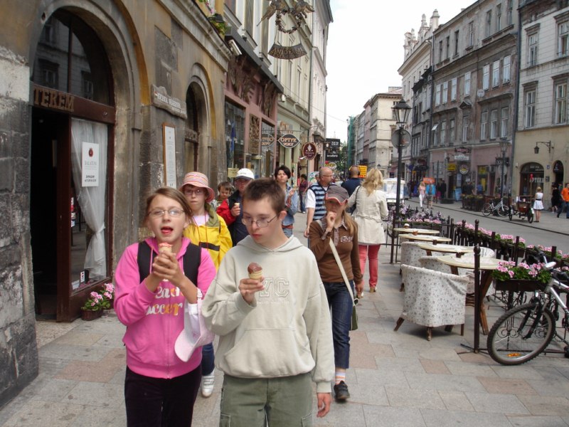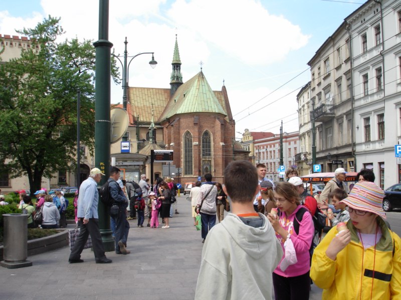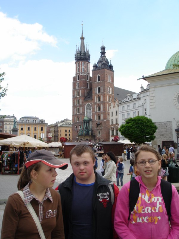 Zwiedzanie rozpoczęliśmy od kościoła św. Floriana przy Placu Matejki. Następnie zatrzymaliśmy się pod pomnikiem Grunwaldzkim. Przechodząc obok Barbakanu i resztek dawnych fortyfikacji miejskich, poprzez główną bramę wjazdową wkroczyliśmy w obręb Starego Miasta. Dalej ulicą Floriańską udaliśmy się na największy plac średniowiecznej Europy – Rynek. Tutaj zwiedzaliśmy Kościół Mariacki, Sukiennice, pomnik Adama Mickiewicza. Mieliśmy możliwość wysłuchania hejnału z wieży kościoła Mariackiego. Dużą atrakcją i zainteresowaniem wśród dzieci cieszyły się dorożki konne. Kontynuując spacer ulicą Grodzką podziwialiśmy kościół św. Piotra i Pawła z postaciami Apostołów na postumentach oraz pomnik ks. Piotra Skargi. Przyszedł także czas na chwilę odpoczynku i na coś co zaczyna się na literkę ,,L” jak lody. Każdy miał możliwość wybrać swój ulubiony smak: truskawka, czekolada, marakuja, pomarańcz itp.. Schłodzeni niebiańskimi smakami przeszliśmy ulicą Kanoniczną na Wzgórze Wawelskie do najwspanialszej rezydencji renesansowej w Europie. W drodze powrotnej był czas na zakup pamiątek i posiłek w McDonald.