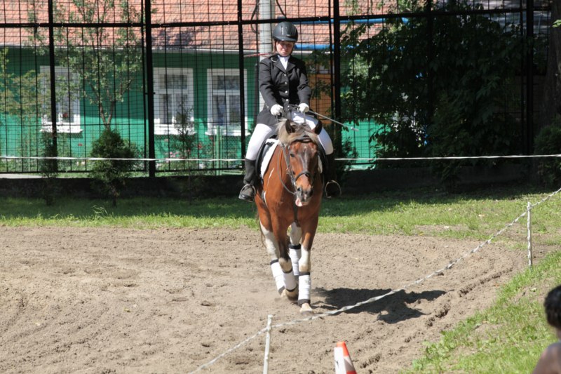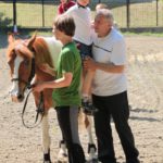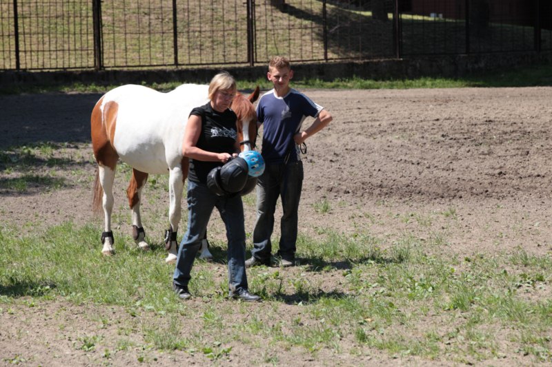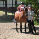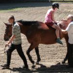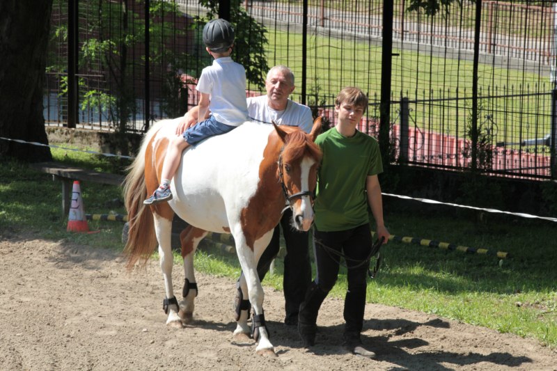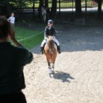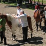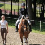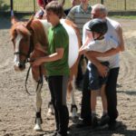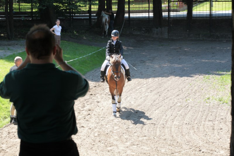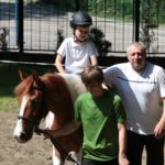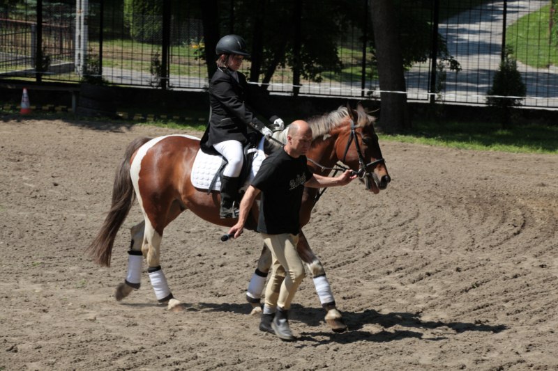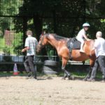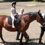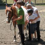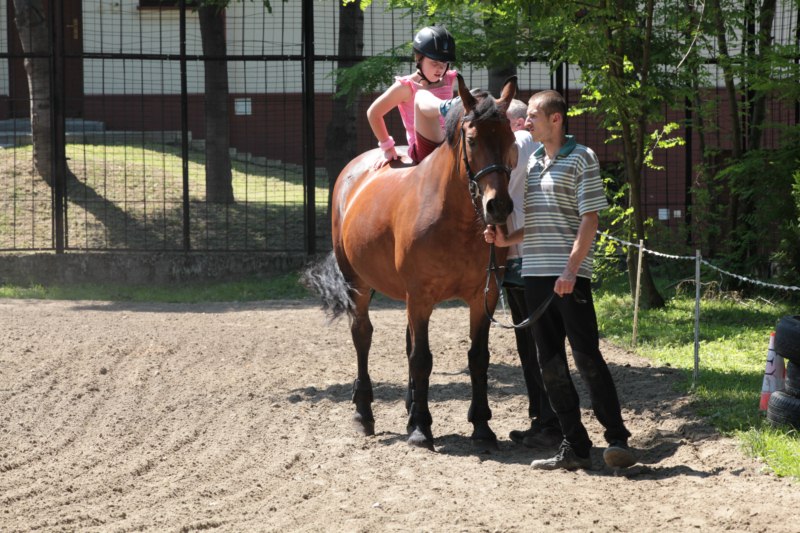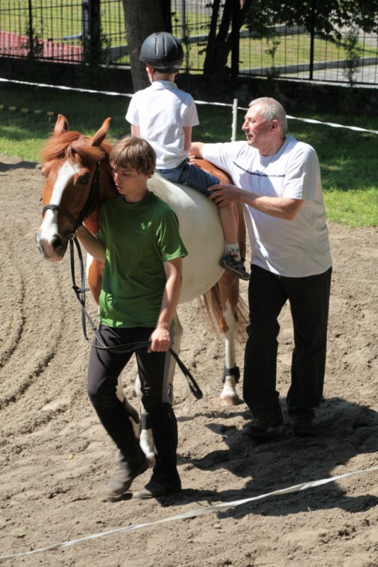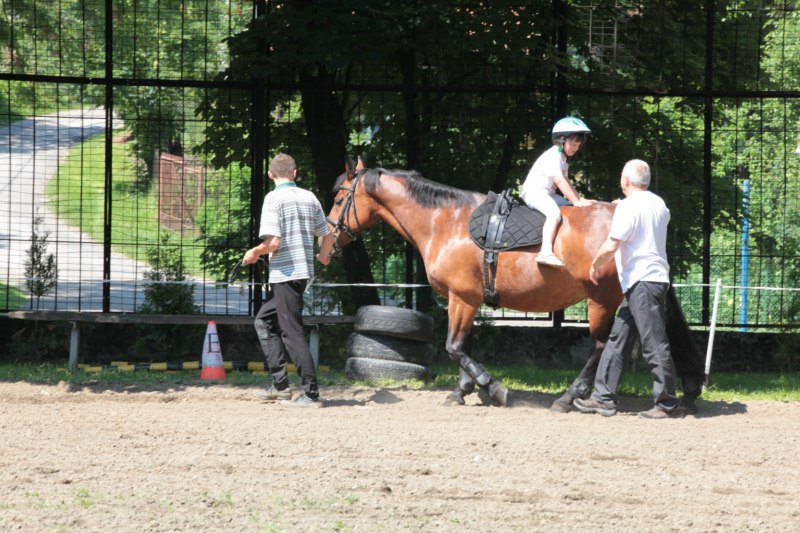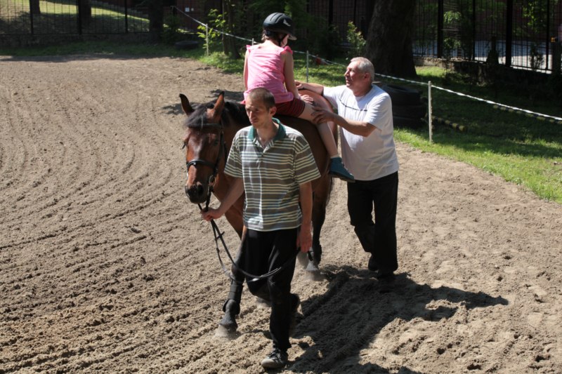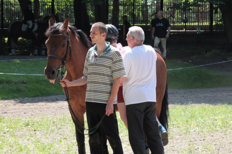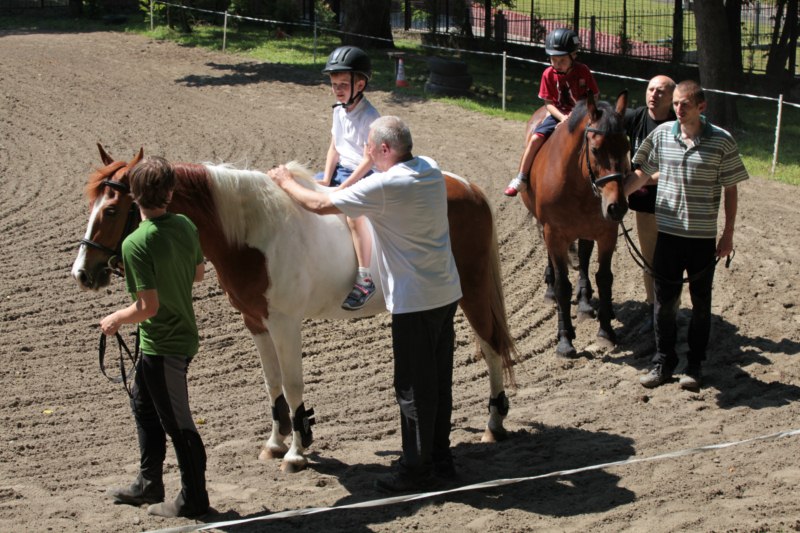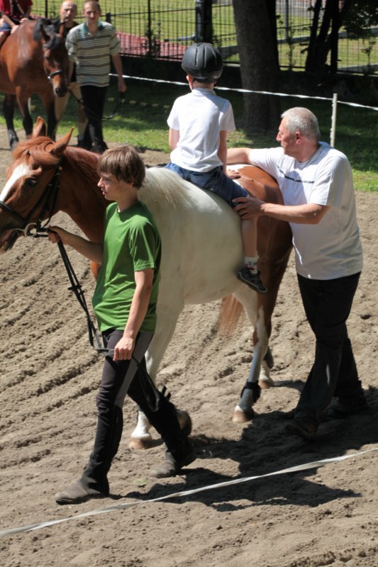 Po części teoretycznej nastąpiła chwila przerwy na kawę i lekki posiłek. Do dyspozycji zaproszonych gości nasze panie kucharki oddały fantastycznie zastawiony stół szwedzki z dużym wyborem sałatek i przekąsek. Część warsztatowa rozpoczęła się od prezentacji form i metod pracy z dzieckiem z Zespołem Downa. Jako uroczy podmiot działań terapeutycznych wystąpiła pełna werwy i zapału Madzia – od przyszłego roku szkolnego uczennica Ośrodka. Następnie nasz gość z Krakowa – Jan Krupiński poprowadził wzorcowe zajęcia z dorosłą już Joasią, która cierpi na porażenie mózgowe. Po zajęciach, które pokazywały szczegółowo wszystkie elementy fizjoterapii na koniu – modelu neurofizjologicznego – nastąpił wyczerpujący komentarz. P. Maciej Witek i p. Michał Stach zademonstrowali elementy psychopedagogicznej jazdy konnej z dwoma chłopcami z autyzmem, zarówno Mateusz jak i Emanuel fantastycznie się spisali w roli modeli. Następnie jeszcze kilkoro naszych podopiecznych miało okazję przejechać się chwilkę na grzbiecie konia na oklep. Na podsumowanie części warsztatowej uczennica klasy przysposabiającej do pracy zawodowej i jednocześnie zawodniczka Olimpiad Specjalnych – Karolina Marcinek, zaprezentowała przejazd konkursowy w konkurencji ujeżdżenie. Na koniec dnia pełnego wrażeń, z zaspokojonym głodem wiedzy, goście udali się na nieoficjalną część zmykającą warsztaty- grilla, gdzie w miłej atmosferze przebiegały swobodne rozmowy i dyskusje podsumowujące wydarzenia Dnia Hipoterapii. Do dyspozycji gości ostała oddana bryczka, można było skorzystać z przejażdżek po parku. W międzyczasie odbywały się rozmowy i konsultacje z rodzicami, specjaliści dzielili się swoją wiedzą, odpowiadali na pytania, rozwiewali wątpliwości.