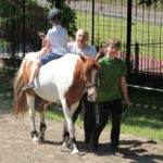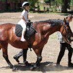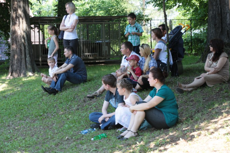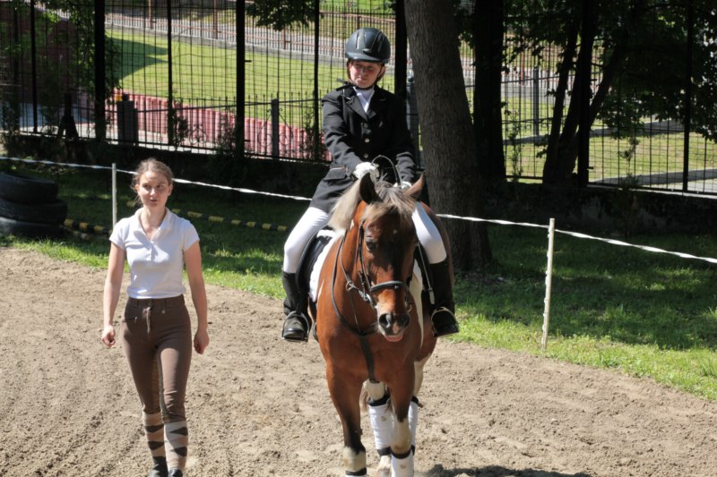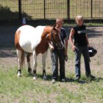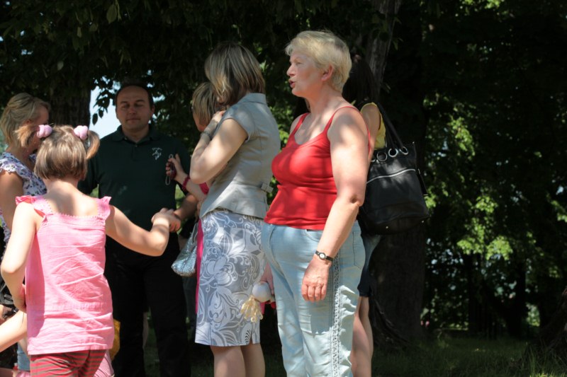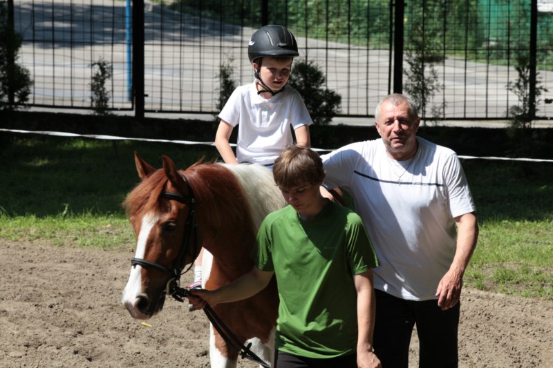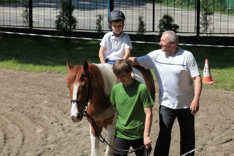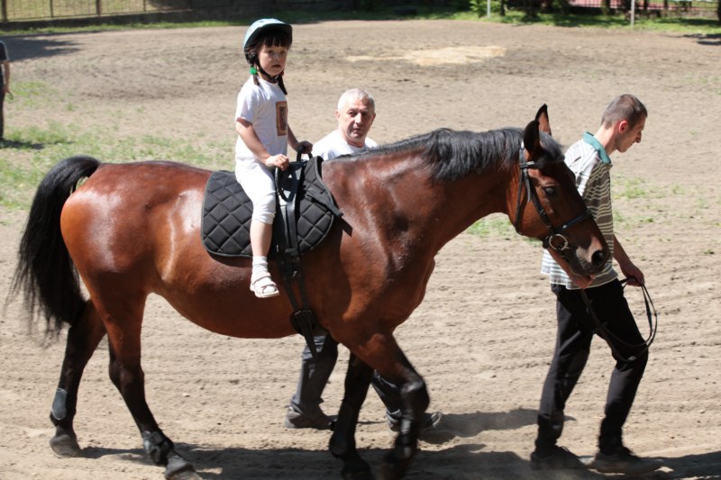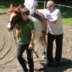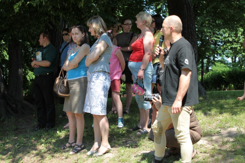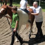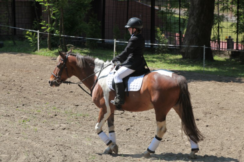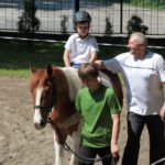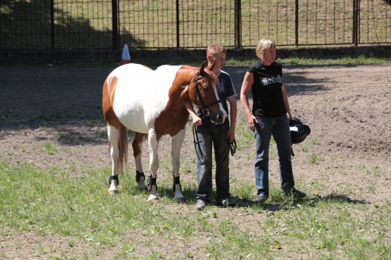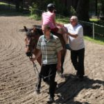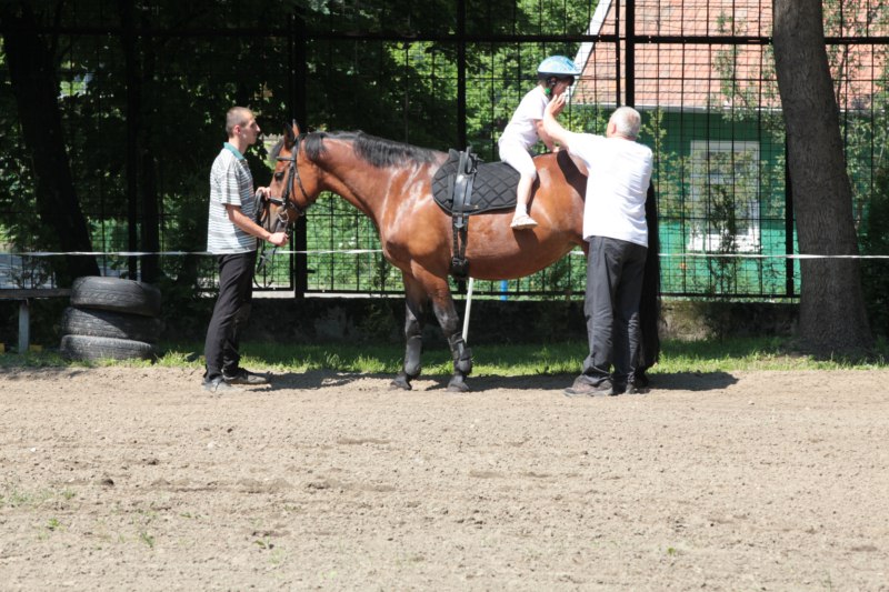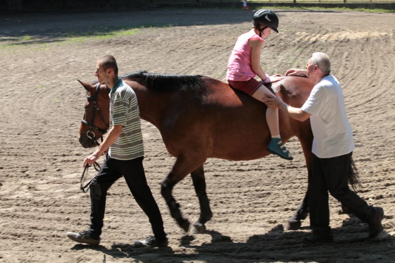 Po części teoretycznej nastąpiła chwila przerwy na kawę i lekki posiłek. Do dyspozycji zaproszonych gości nasze panie kucharki oddały fantastycznie zastawiony stół szwedzki z dużym wyborem sałatek i przekąsek. Część warsztatowa rozpoczęła się od prezentacji form i metod pracy z dzieckiem z Zespołem Downa. Jako uroczy podmiot działań terapeutycznych wystąpiła pełna werwy i zapału Madzia – od przyszłego roku szkolnego uczennica Ośrodka. Następnie nasz gość z Krakowa – Jan Krupiński poprowadził wzorcowe zajęcia z dorosłą już Joasią, która cierpi na porażenie mózgowe. Po zajęciach, które pokazywały szczegółowo wszystkie elementy fizjoterapii na koniu – modelu neurofizjologicznego – nastąpił wyczerpujący komentarz. P. Maciej Witek i p. Michał Stach zademonstrowali elementy psychopedagogicznej jazdy konnej z dwoma chłopcami z autyzmem, zarówno Mateusz jak i Emanuel fantastycznie się spisali w roli modeli. Następnie jeszcze kilkoro naszych podopiecznych miało okazję przejechać się chwilkę na grzbiecie konia na oklep. Na podsumowanie części warsztatowej uczennica klasy przysposabiającej do pracy zawodowej i jednocześnie zawodniczka Olimpiad Specjalnych – Karolina Marcinek, zaprezentowała przejazd konkursowy w konkurencji ujeżdżenie. Na koniec dnia pełnego wrażeń, z zaspokojonym głodem wiedzy, goście udali się na nieoficjalną część zmykającą warsztaty- grilla, gdzie w miłej atmosferze przebiegały swobodne rozmowy i dyskusje podsumowujące wydarzenia Dnia Hipoterapii. Do dyspozycji gości ostała oddana bryczka, można było skorzystać z przejażdżek po parku. W międzyczasie odbywały się rozmowy i konsultacje z rodzicami, specjaliści dzielili się swoją wiedzą, odpowiadali na pytania, rozwiewali wątpliwości.