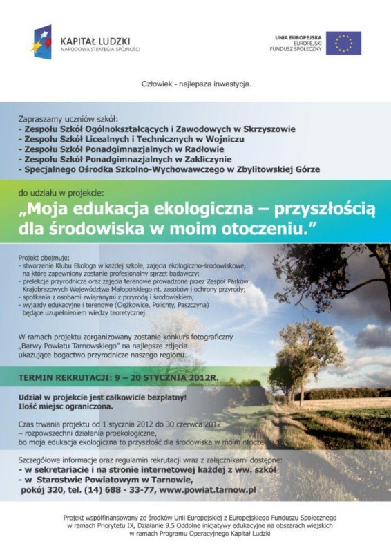 Nasz Ośrodek znalazł się w gronie szkół, które wezmą udział w projekcie organizowanym przez Starostwo Powiatowe w Tarnowie: „Moja edukacja ekologiczna – przyszłością dla środowiska w moim otoczeniu.” Realizacja programu przewidziana jest od stycznia do czerwca 2012r. na terenie czterech szkół ponadgimnazjalnych, dla których organem prowadzącym jest Powiat Tarnowski – ZSP w Zakliczynie, ZSP w Radłowie, ZSOiZ w Skrzyszowie, ZSLiT w Wojniczu oraz SOSW w Zbylitowskiej Górze. Projekt zakłada stworzenie Klubu Ekologa w każdej ze szkół, którego celem jest promocja postaw ekologicznych. Uczestnicy projektu w ramach Klubu wezmą udział w prelekcjach przyrodniczych prowadzonych przez Zespół Parków Krajobrazowych w Tarnowie, zajęciach edukacji ekologiczno-środowiskowej, spotkaniach z osobami związanymi z przyrodą. Ponadto w ramach projektu zostaną zorganizowane wyjazdy do Ośrodka Edukacji Ekologicznej w Polichtach, do rezerwatu Skamieniałe Miasto i Muzeum Przyrodniczego w Ciężkowicach. W okresie realizacji projektu ogłoszony zostanie konkurs fotograficzny pn.: „Barwy Powiatu”, którego efektem będzie wystawa fotograficzna oraz powstanie albumu z pracami uczniów. Projekt w całości jest dofinansowany: 85% z Europejskiego Funduszu Społecznego i 15% z Budżetu Państwa. Koordynatorem projektu jest p. Ewa czerwińska – Biś.