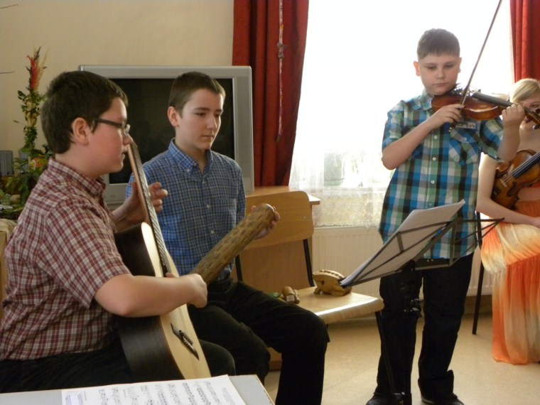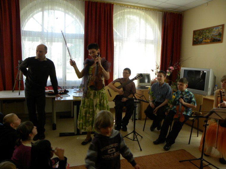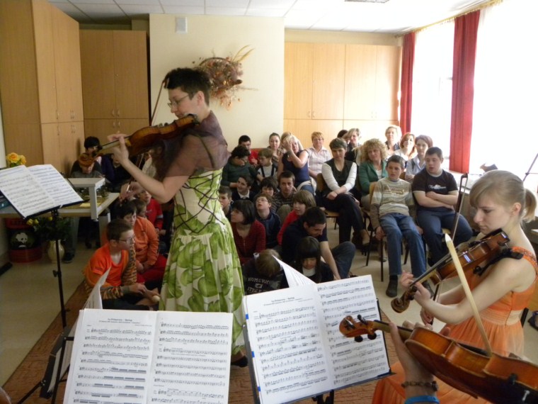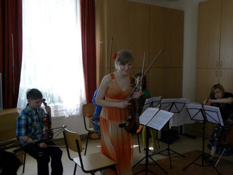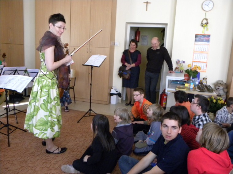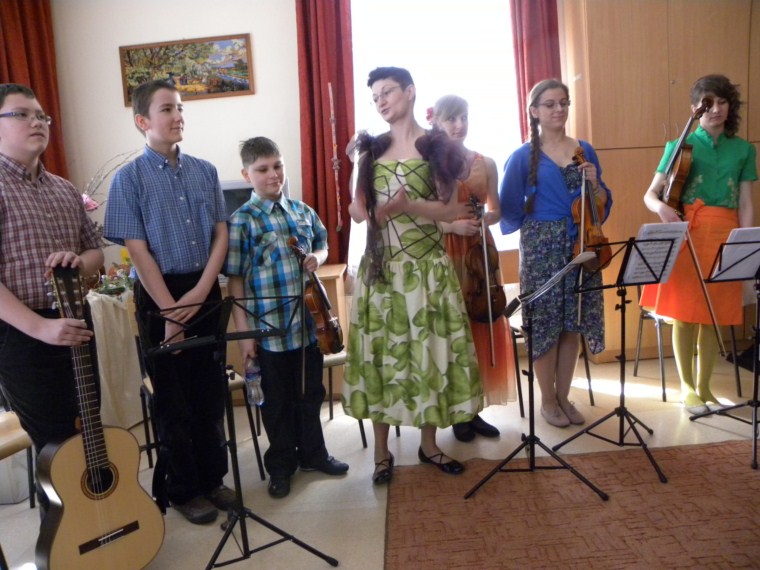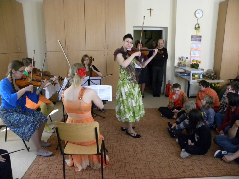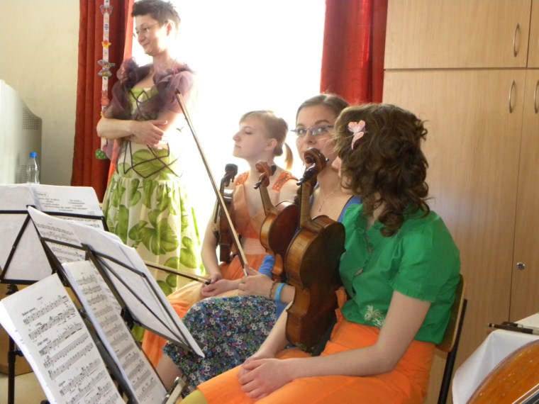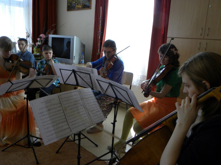 Po raz kolejny gościliśmy w naszym Ośrodku panią Danutę Augustyn z uczniami Państwowej Szkoły Muzycznej w Tarnowie. Kwartet smyczkowy pod kierownictwem pani Danusi wykonał dla naszych podopiecznych kilka utworów różnych wykonawców. Każdy fragment koncertu poprzedzony był odpowiednim komentarzem dopasowanym do potrzeb i możliwości słuchaczy. Obszerny wstęp zachęcił naszych podopiecznych do bardzo aktywnego i uważnego słuchania utworów. Na początek zagrał kwartet w składzie: Karolina, Zuzia, Ewa i Patrycja, który wykonał fragment Czterech pór roku Vivaldiego – Wiosna I cz. Allegro. Nasze dzieci z dużym zaangażowaniem towarzyszyły muzykom grając na instrumentach perkusyjnych. Następnie na scenie zaprezentowali się trzej uroczy chłopcy: Maciej, Kuba i Kacper, którzy wykonali utwory J.M. Zenamena w wersji na skrzypce, gitarę i instrumenty perkusyjne. Były to cztery części: Źródło, Bagna, Wiosenna noc, Na rynku. Na zakończenie ponownie głos zabrał kwartet smyczkowy. Ujmujące instrumentalistki wykonały najpierw utwory B. Bartoka – piosenki dla dzieci cz. Kanon, Allegro, Allegretto oraz utwory Wernera Thomasa – Mifune: Südamerikanische i Saitensprünge.
