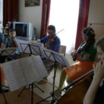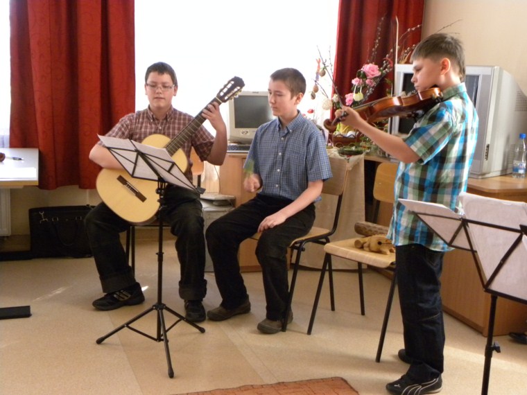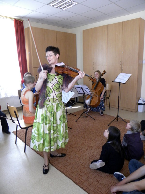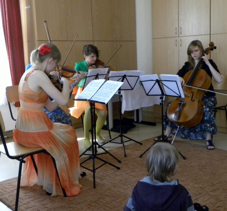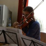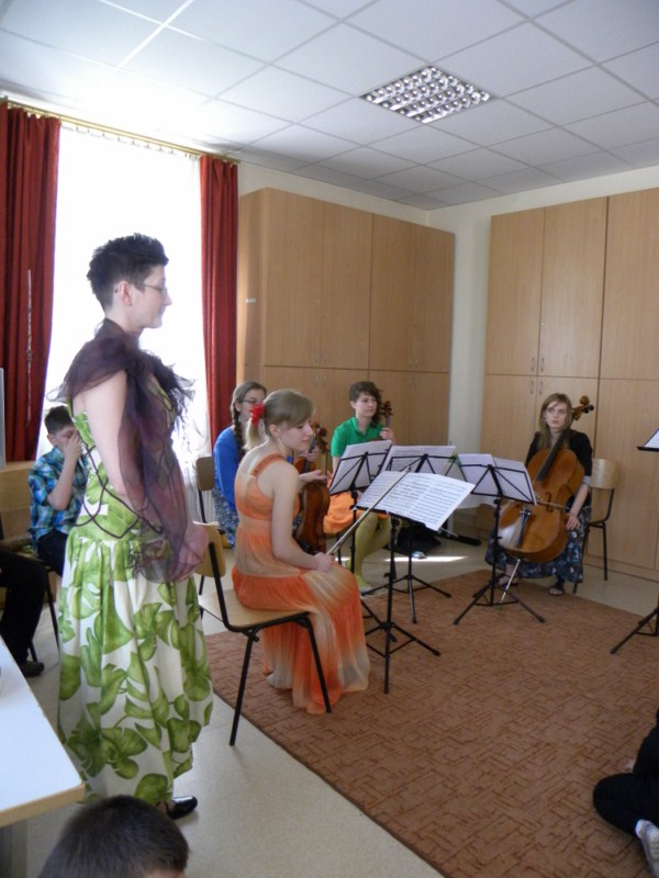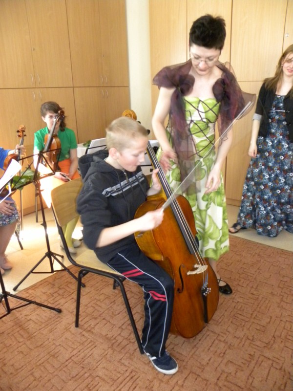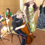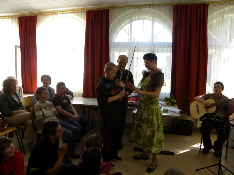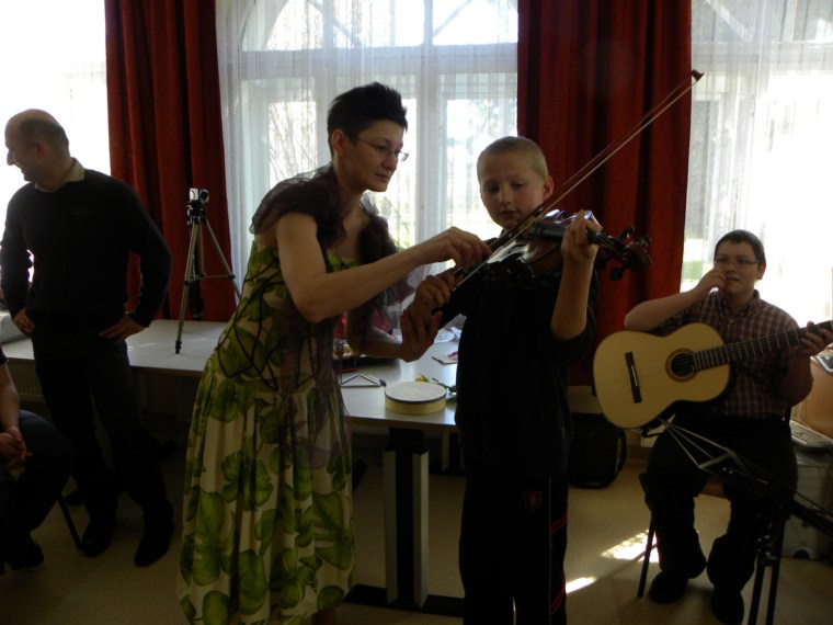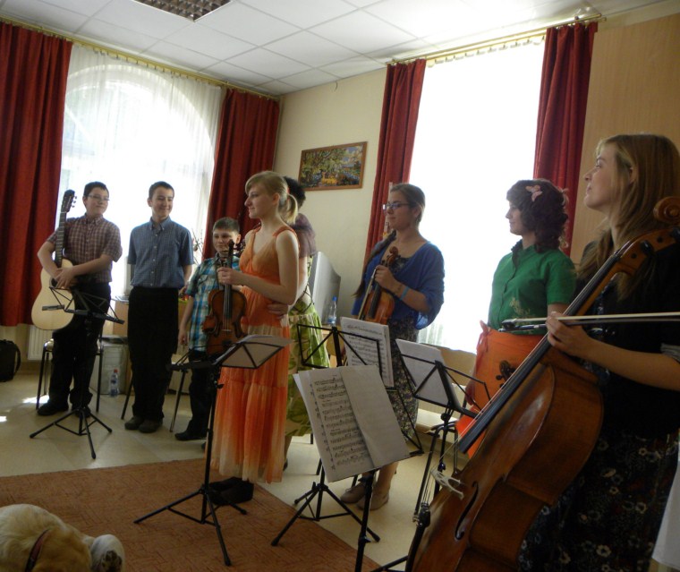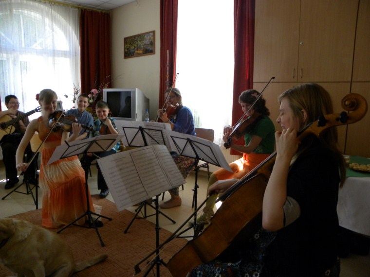 Po raz kolejny gościliśmy w naszym Ośrodku panią Danutę Augustyn z uczniami Państwowej Szkoły Muzycznej w Tarnowie. Kwartet smyczkowy pod kierownictwem pani Danusi wykonał dla naszych podopiecznych kilka utworów różnych wykonawców. Każdy fragment koncertu poprzedzony był odpowiednim komentarzem dopasowanym do potrzeb i możliwości słuchaczy. Obszerny wstęp zachęcił naszych podopiecznych do bardzo aktywnego i uważnego słuchania utworów. Na początek zagrał kwartet w składzie: Karolina, Zuzia, Ewa i Patrycja, który wykonał fragment Czterech pór roku Vivaldiego – Wiosna I cz. Allegro. Nasze dzieci z dużym zaangażowaniem towarzyszyły muzykom grając na instrumentach perkusyjnych. Następnie na scenie zaprezentowali się trzej uroczy chłopcy: Maciej, Kuba i Kacper, którzy wykonali utwory J.M. Zenamena w wersji na skrzypce, gitarę i instrumenty perkusyjne. Były to cztery części: Źródło, Bagna, Wiosenna noc, Na rynku. Na zakończenie ponownie głos zabrał kwartet smyczkowy. Ujmujące instrumentalistki wykonały najpierw utwory B. Bartoka – piosenki dla dzieci cz. Kanon, Allegro, Allegretto oraz utwory Wernera Thomasa – Mifune: Südamerikanische i Saitensprünge.