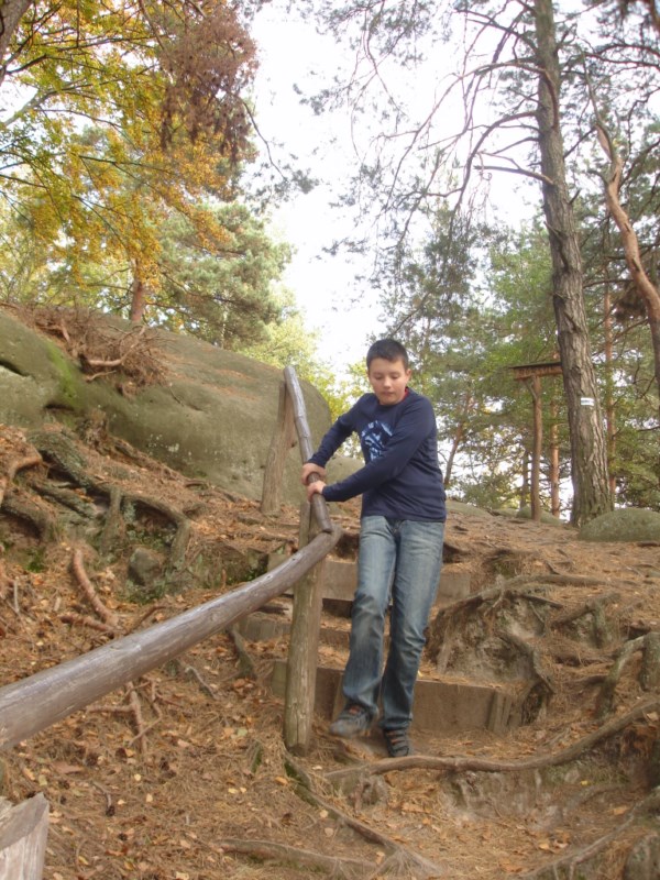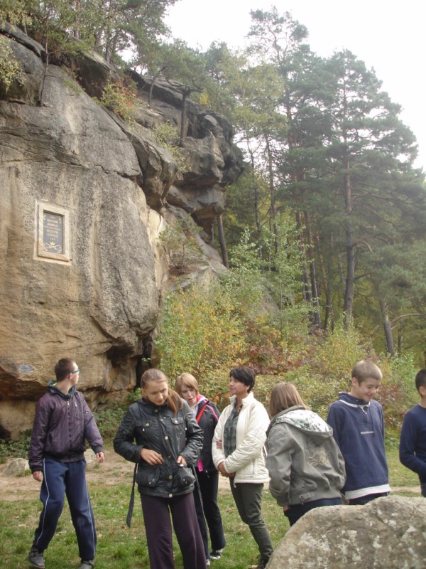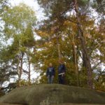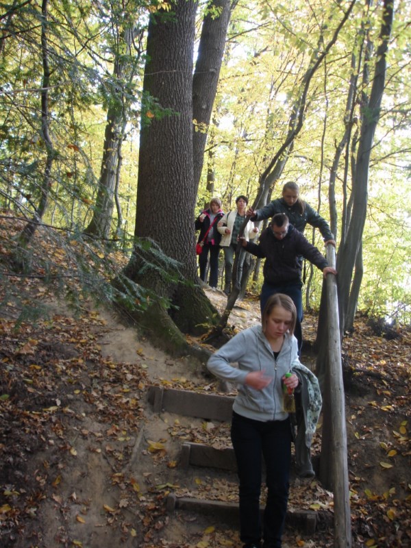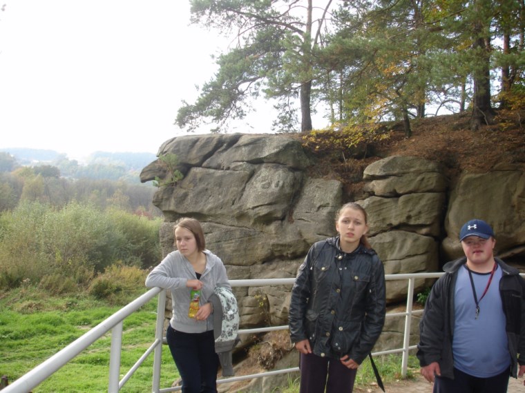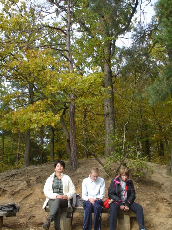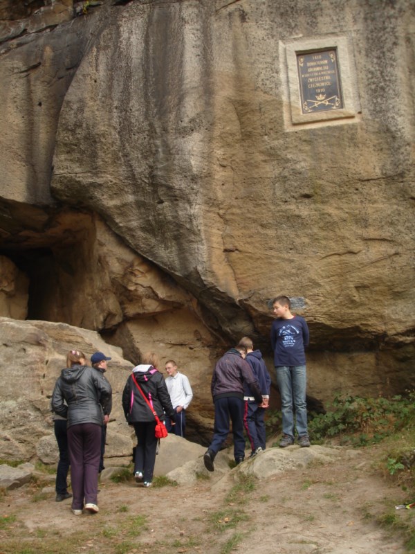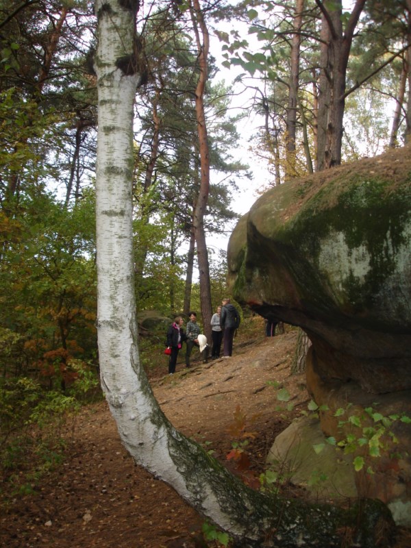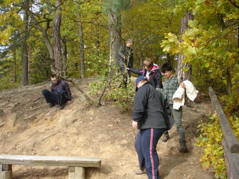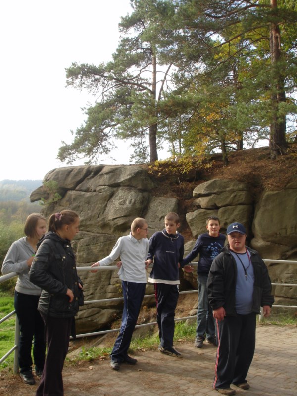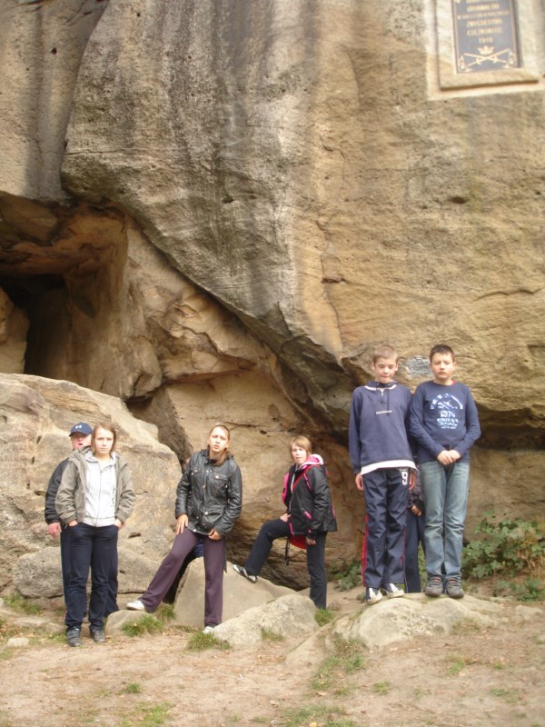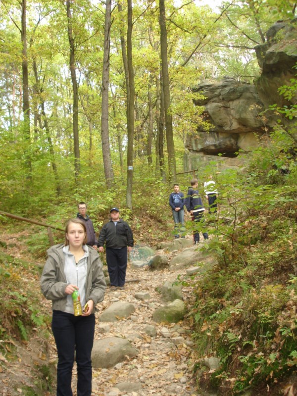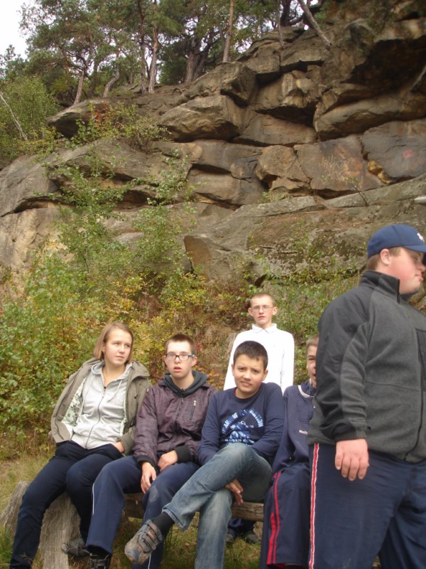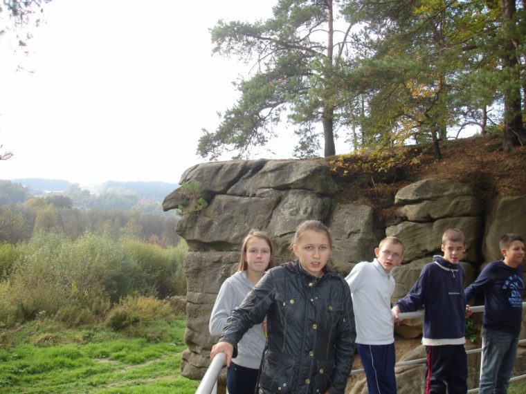 Słoneczna pogoda sprzyjała zarówno wędrówce jak i podziwianiu przepięknie wybarwiających się kolorami jesieni krajobrazów. Wszyscy nieco zmęczeni, lecz pełni wrażeń ruszyli w inną część Parku Krajobrazowego, słynną z tzw. „Skamieniałego miasteczka”. Nie lada atrakcję stanowiło podziwianie niezwykłych formacji skalnych z piaskowca powstałych w wyniku erozji. Jeszcze większą radość wzbudziła niewątpliwie możliwość podziwiania uroków okolicy po wspięciu się na te niesamowite skały.