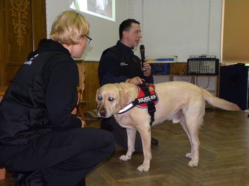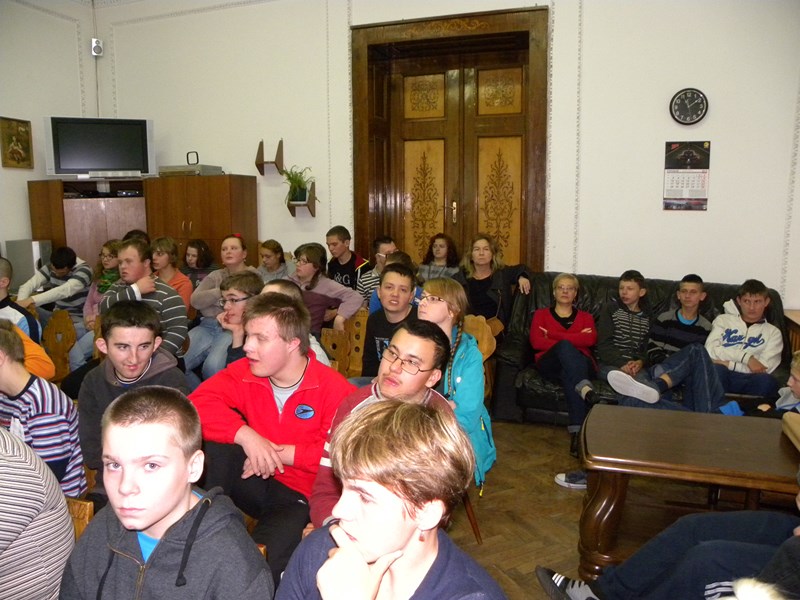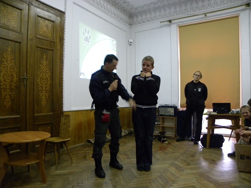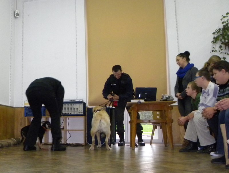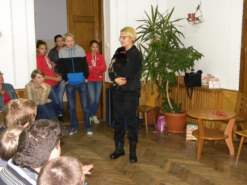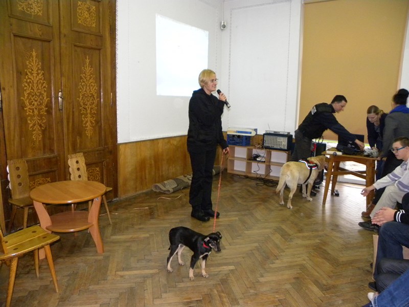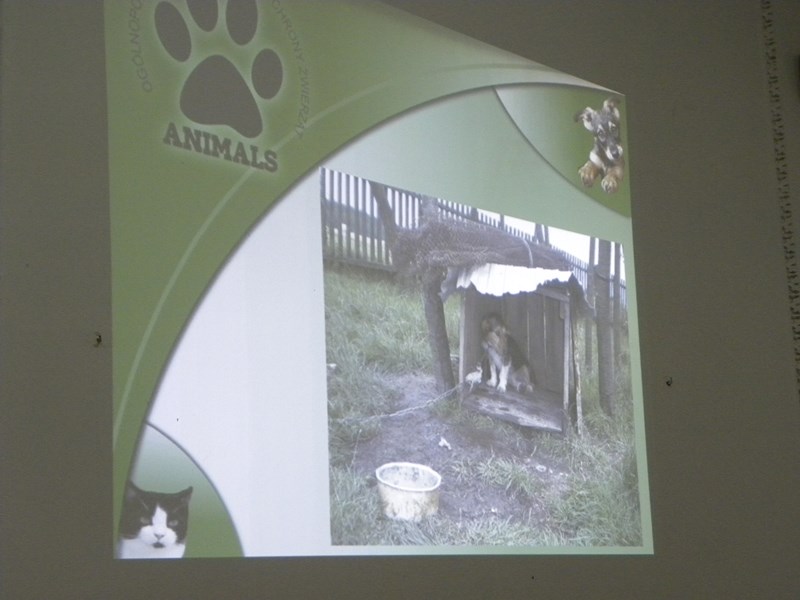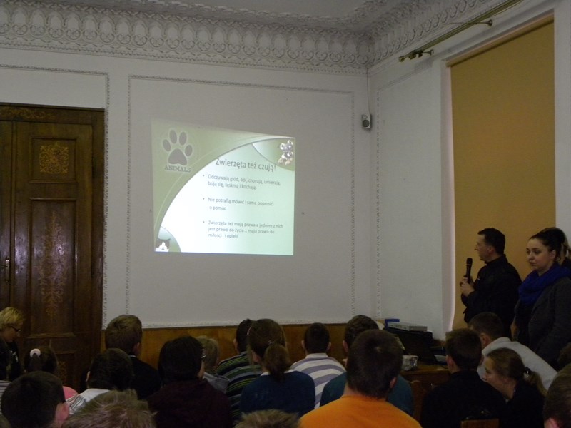 Aby wprowadzić dzieci i młodzież w tematykę spotkania, wyświetlony został film animowany o Świętym Franciszku z Asyżu. Nasi uczniowie dowiedzieli się w ten przystępny sposób, kim był założyciel jednego z najbardziej znanych zakonów na świecie i jakie prawdy głosił. Bogatsi o tę wiedzę młodzi przyjaciele zwierząt powitali wyjątkowych gości – pracowników Polskiego Towarzystwa Opieki nad Zwierzętami, którzy opowiedzieli im o swojej pracy, przytoczyli wiele dramatycznych historii ratowanych przez nich zwierząt, uświadomili naszym uczniom jak ważna jest prawidłowa opieka nad czworonogami, a także nauczyli jak powinniśmy się zachować w wypadku ataku groźnego psa. Z pewnością nie jednemu młodemu słuchaczowi zakręciła się łza w oku, na widok zdjęć psów oraz zwierząt gospodarczych, zabieranych właścicielom, którzy nie potrafili się nimi odpowiednio zająć. Z pewnością każdy uczeń będzie teraz wiedział, jak się zachowywać w obecności obcego psa, aby nie prowokować go do ataku.