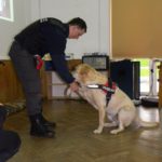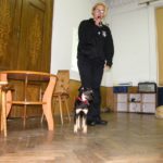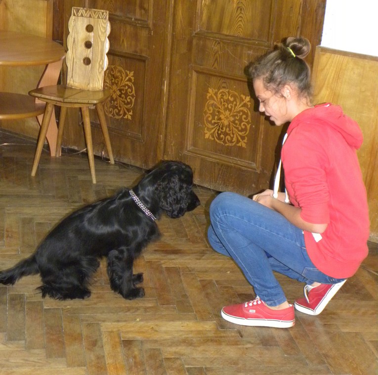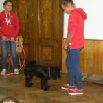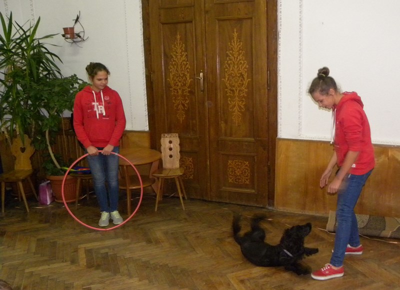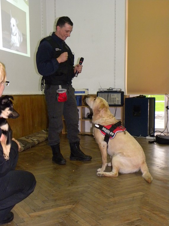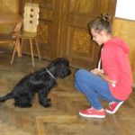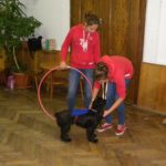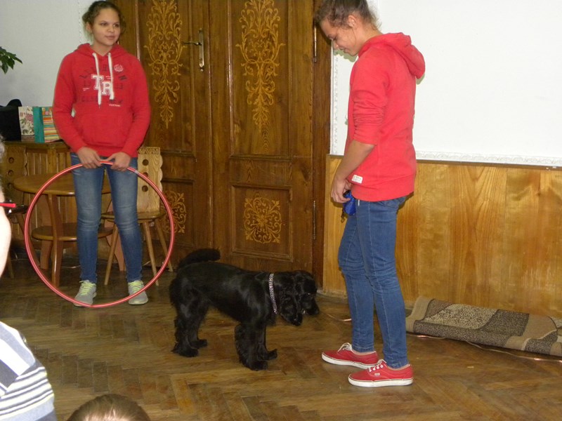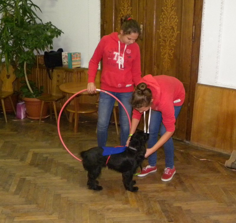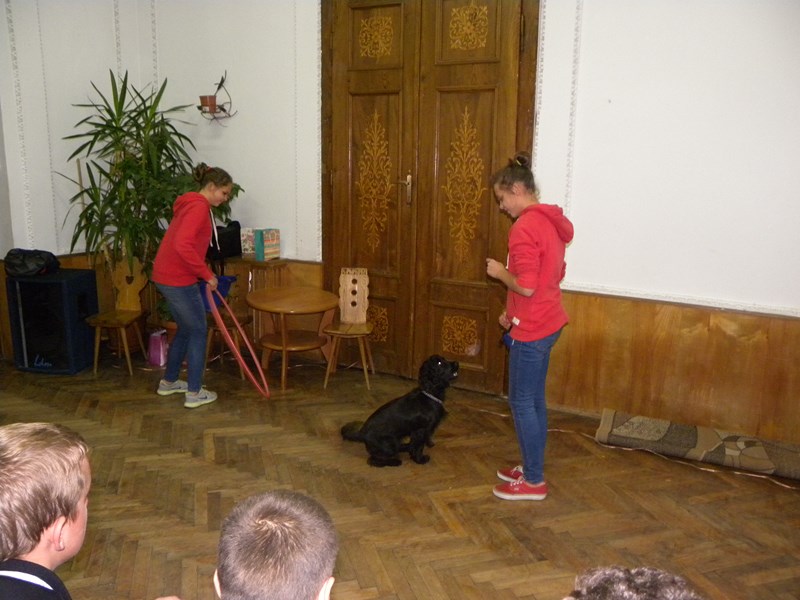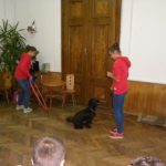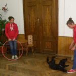 Kolejni goście łez wzruszenia ani smutku już nie wywoływali, ale z pewnością łzy szczęścia i radości się nie raz pojawiły. Dwie gimnazjalistki – Patrycja i Oliwia, zaprezentowały dzieciom zestaw sztuczek, wykonywanych przez ich uroczego i świetnie wyszkolonego psa Kajlę. Kajla niczym prawdziwa gwiazda kłaniała się, obracała, turlała, podskakiwała na każdą komendę swoich właścicielek, a nawet padała nieżywa na znak pif paf. Pokazała również umiejętności nie tylko aktorskie, lecz także sportowe – niezrażona padającym deszczem, brawurowo przebiegła tor agility, wywołując gromkie brawa naszych podopiecznych.