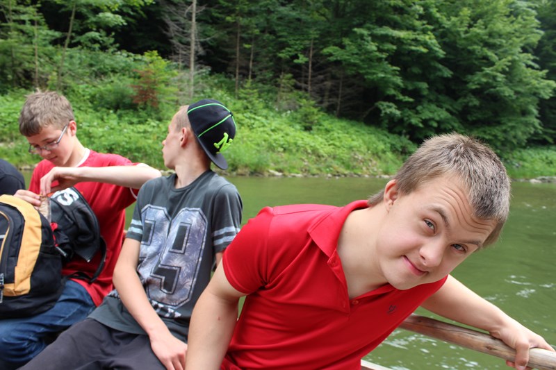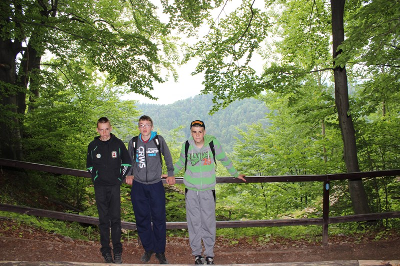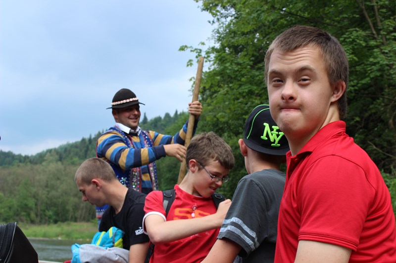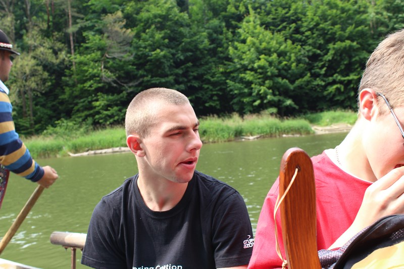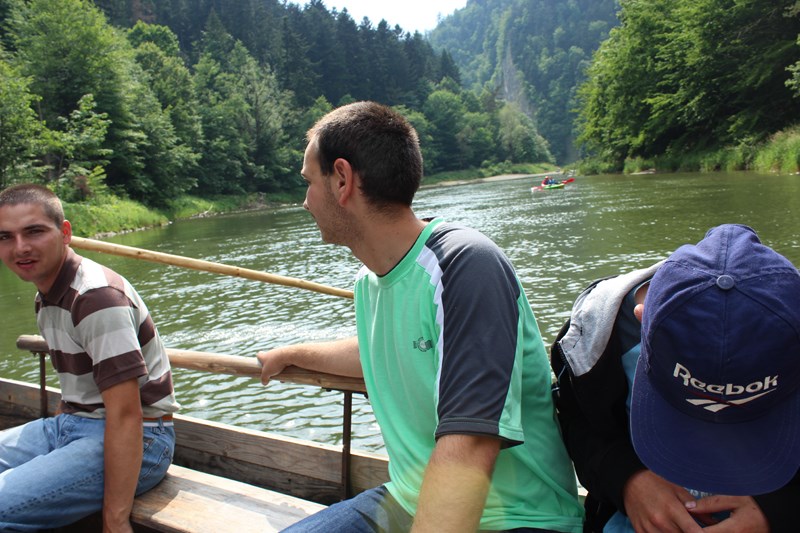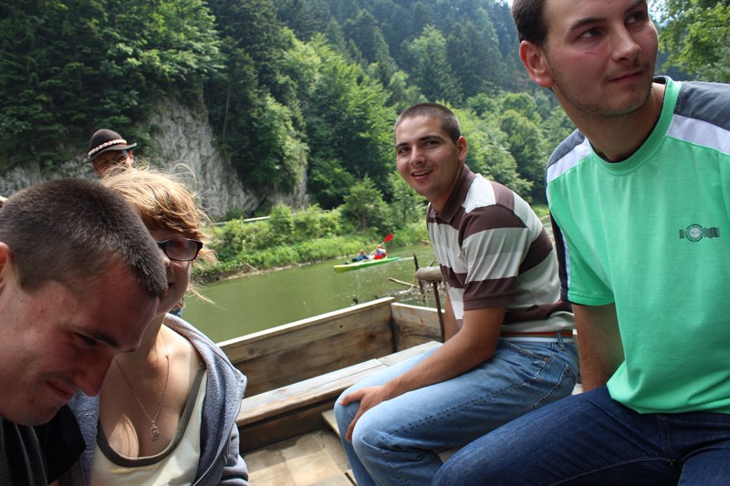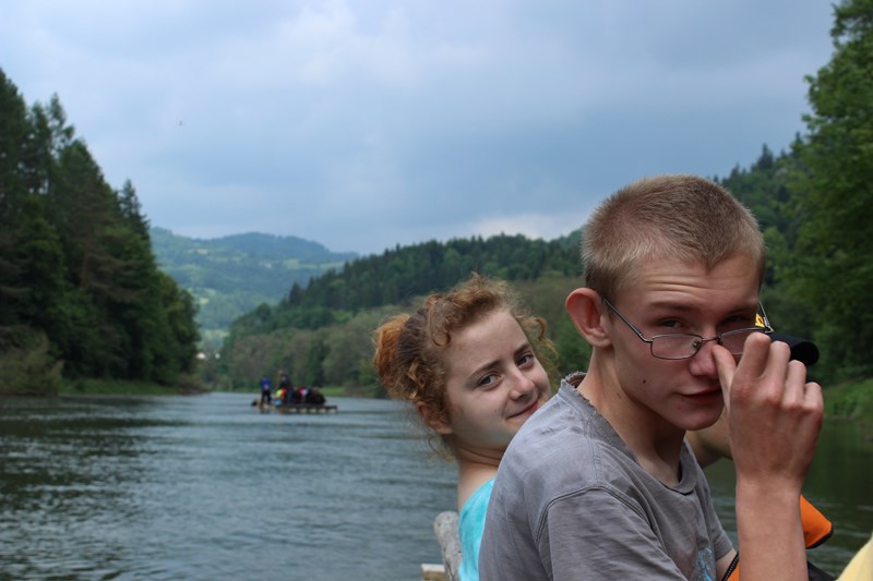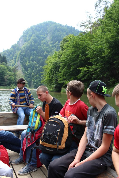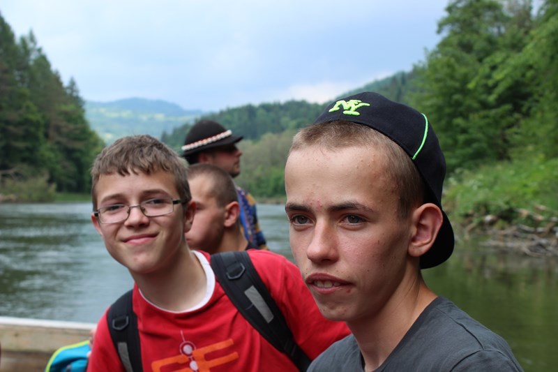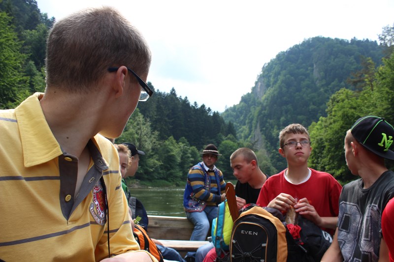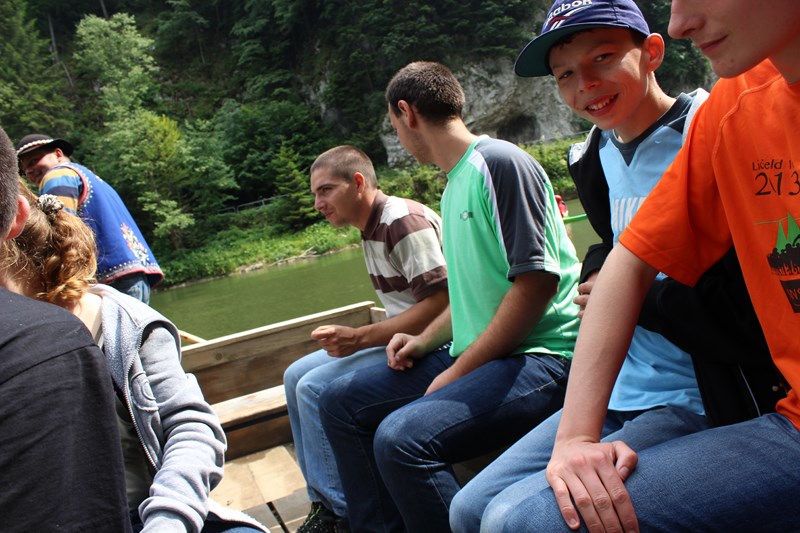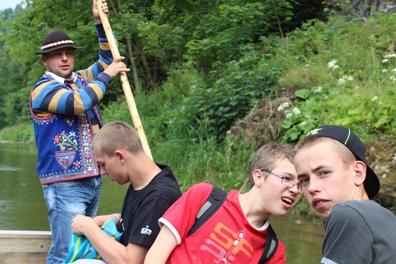 Wielkie wrażenie wywarła na wszystkich także wycieczka do Wąwozu Homole, położonego niedaleko punku noclegowego. Wytrwali wędrowcy z zachwytem spoglądali na efektowne kaskady potoku, wijącego się pośród malowniczych wapiennych ścian Wąwozu. Ogromne głazy i kamienie budziły wśród naszych podopiecznych respekt, zdumienie i zachwyt. Po dotarciu na Bereśnik, młodzież podziwiała cudowną panoramę Beskidu Sądeckiego. Krótkie lekcje geografii na szczycie, przeplatały chwile upajania się pięknem majestatycznych gór. Po obiedzie w regionalnej karczmie przyszedł czas na następną niespodziankę – zjazd z góry kolejką linową , który dostarczył niesamowitego odczucia – podziwiania krajobrazów z lotu ptaka. Po tylu przeżyciach wędrowcy regenerowali siły w Pijalni Wód Mineralnych w Szczawnicy. Ale to nie był jeszcze koniec atrakcji! Przejście promenadą wzdłuż urokliwego Grajcarka, doprowadziło turystów do przystani, gdzie przy brzegu kołysała się tratwa flisacka. Sporą niespodzianką okazał się spływ Dunajcem, rzeką z którą tak blisko są związani nasi wychowankowie. Flisak prowadzący tratwę, opowiadał regionalne gawędy, nie szczędząc przy tym humoru i życzliwości, a wychowankowie podziwiać mogli sąsiadujące z brzegami rzeki cudowne masywy skalne Sokolicy.
