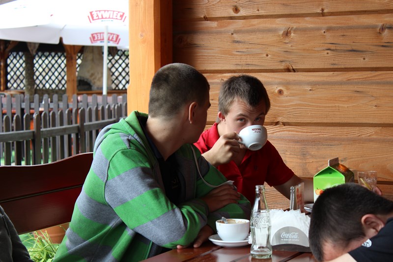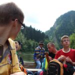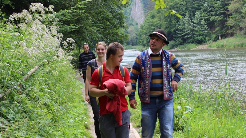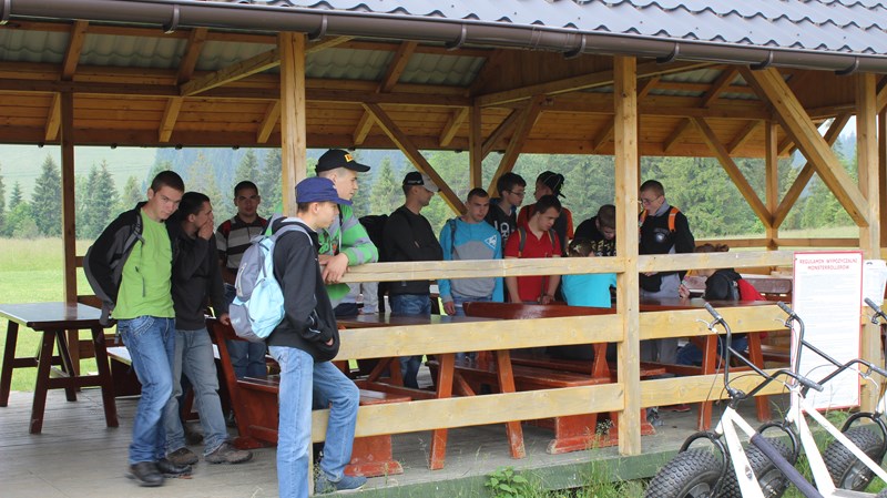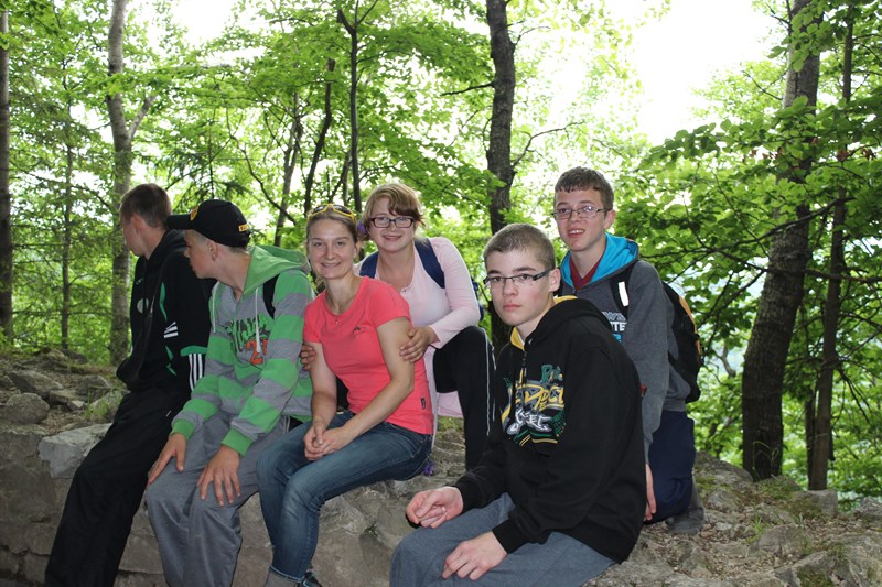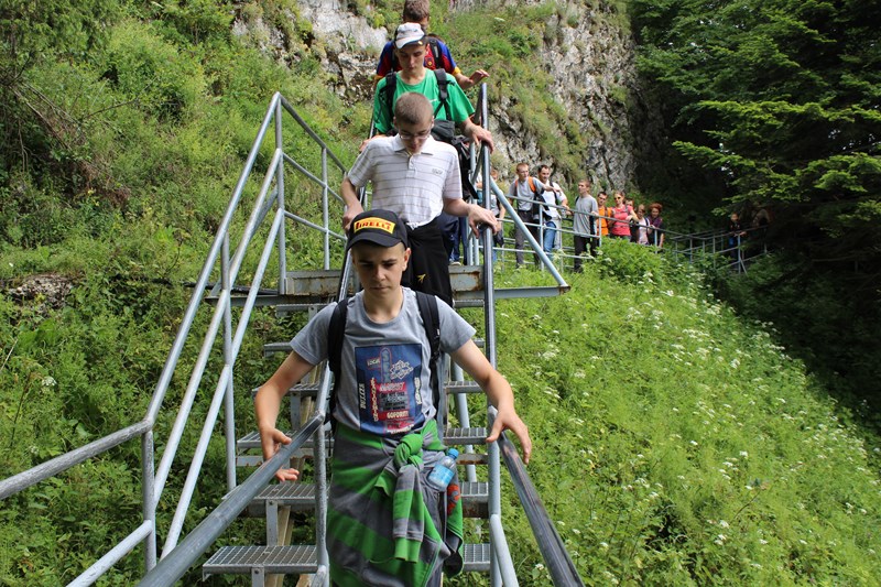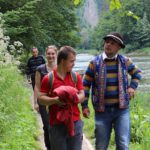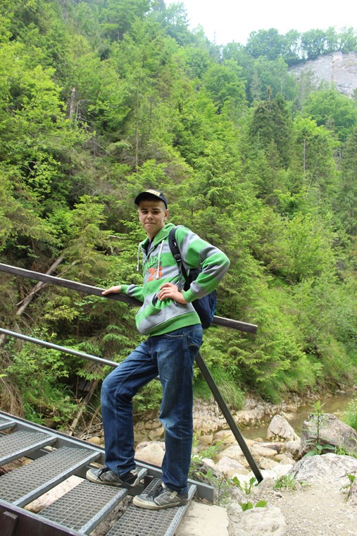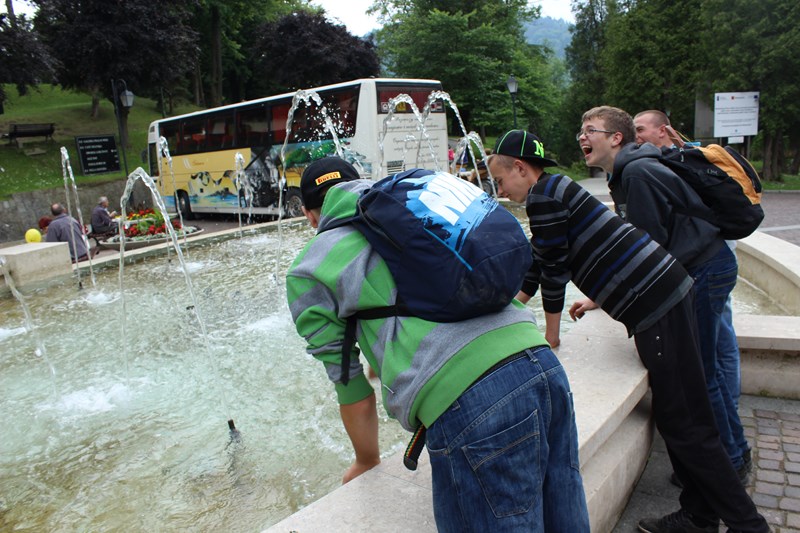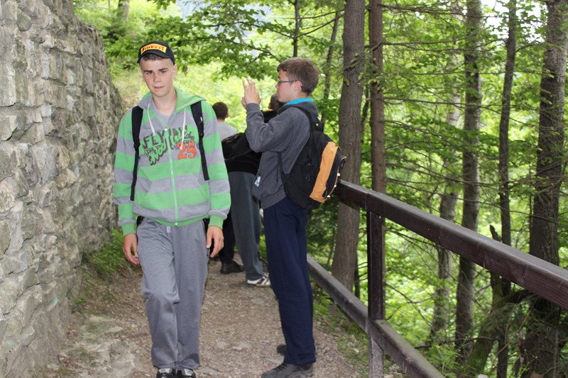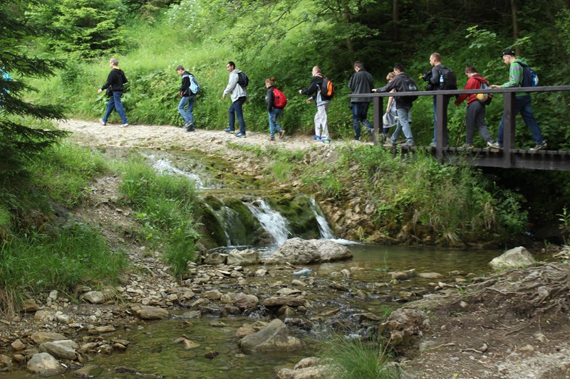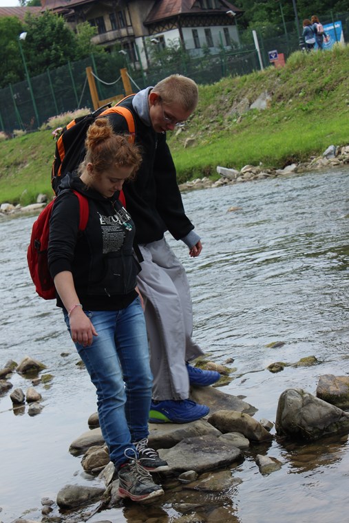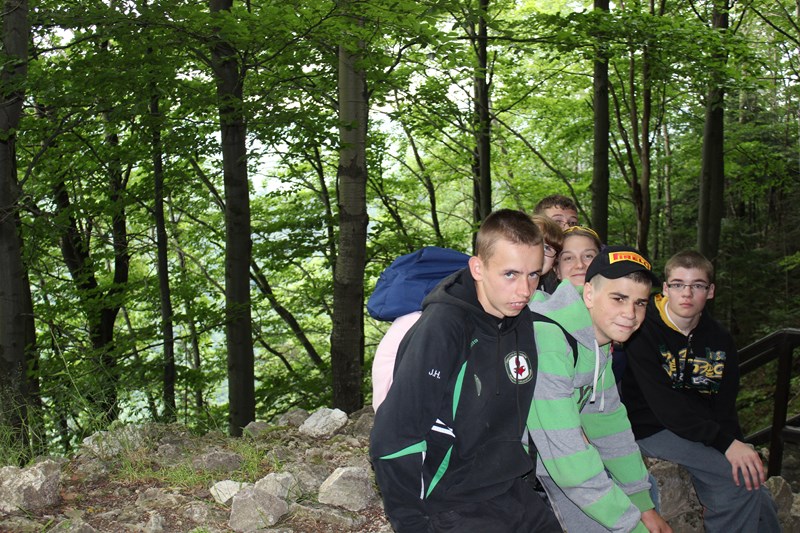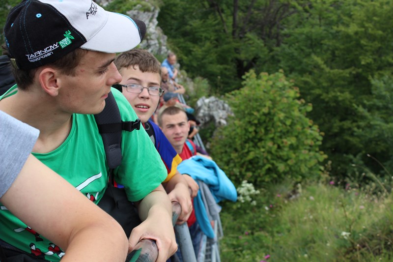 Wielkie wrażenie wywarła na wszystkich także wycieczka do Wąwozu Homole, położonego niedaleko punku noclegowego. Wytrwali wędrowcy z zachwytem spoglądali na efektowne kaskady potoku, wijącego się pośród malowniczych wapiennych ścian Wąwozu. Ogromne głazy i kamienie budziły wśród naszych podopiecznych respekt, zdumienie i zachwyt. Po dotarciu na Bereśnik, młodzież podziwiała cudowną panoramę Beskidu Sądeckiego. Krótkie lekcje geografii na szczycie, przeplatały chwile upajania się pięknem majestatycznych gór. Po obiedzie w regionalnej karczmie przyszedł czas na następną niespodziankę – zjazd z góry kolejką linową , który dostarczył niesamowitego odczucia – podziwiania krajobrazów z lotu ptaka. Po tylu przeżyciach wędrowcy regenerowali siły w Pijalni Wód Mineralnych w Szczawnicy. Ale to nie był jeszcze koniec atrakcji! Przejście promenadą wzdłuż urokliwego Grajcarka, doprowadziło turystów do przystani, gdzie przy brzegu kołysała się tratwa flisacka. Sporą niespodzianką okazał się spływ Dunajcem, rzeką z którą tak blisko są związani nasi wychowankowie. Flisak prowadzący tratwę, opowiadał regionalne gawędy, nie szczędząc przy tym humoru i życzliwości, a wychowankowie podziwiać mogli sąsiadujące z brzegami rzeki cudowne masywy skalne Sokolicy.