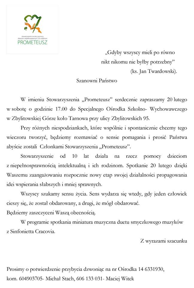 W imieniu Stowarzyszenia „Prometeusz” serdecznie zapraszamy 20 lutego w sobotę o godzinie 17.00 do naszego Ośrodka. Przy różnych niespodziankach, które wspólnie i spontanicznie chcemy tego wieczoru tworzyć, będziemy rozmawiać o sensie pomagania i prosić Państwa abyście zostali Członkami Stowarzyszenia „Prometeusz”.