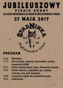 Rocznicowy Piknik Konny odbędzie się w sobotę 27 maja w naszym Ośrodku. Startujemy o 15.00. Jak zawsze będzie to impreza charytatywna i integracyjna, na którą zapraszamy wszystkich Przyjaciół wraz z całymi rodzinami.Zachęcamy do wspólnego świętowania tego jubileuszu! Do zobaczenia!