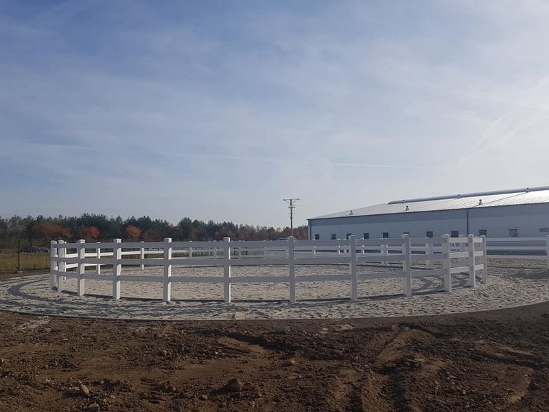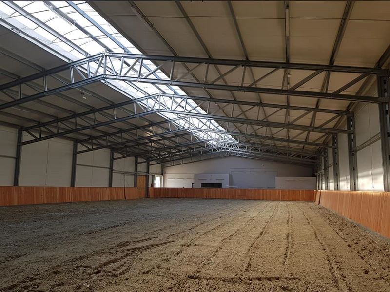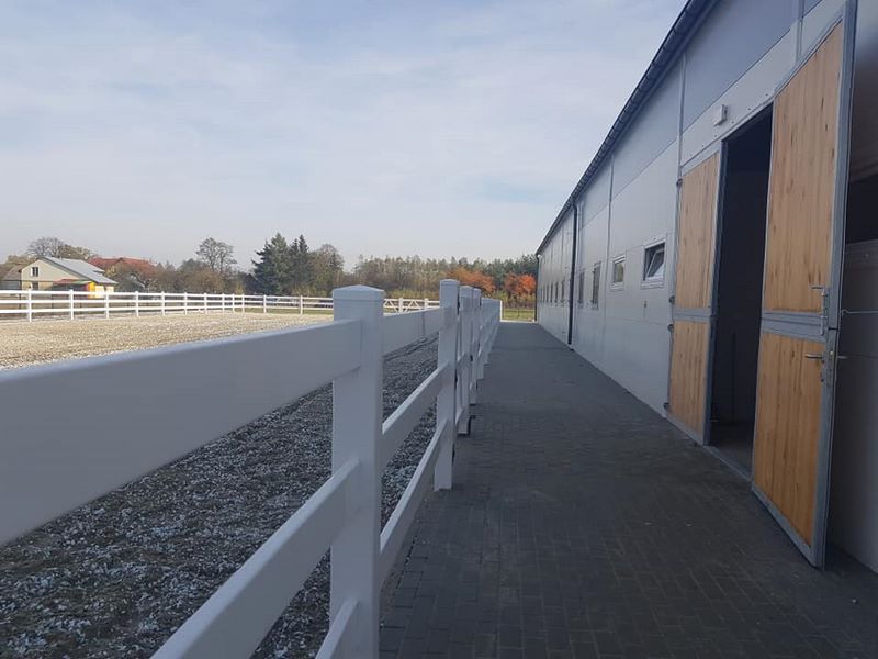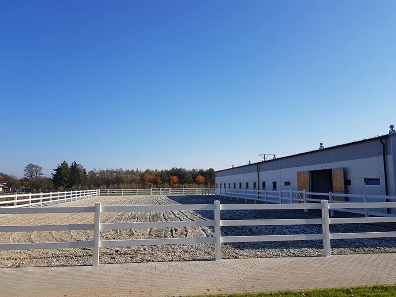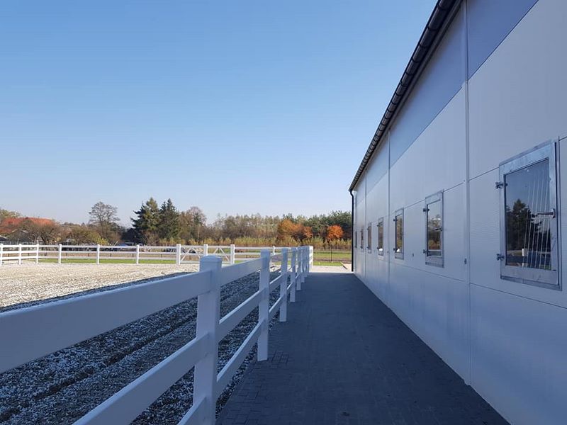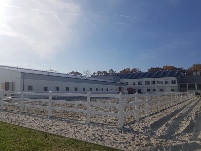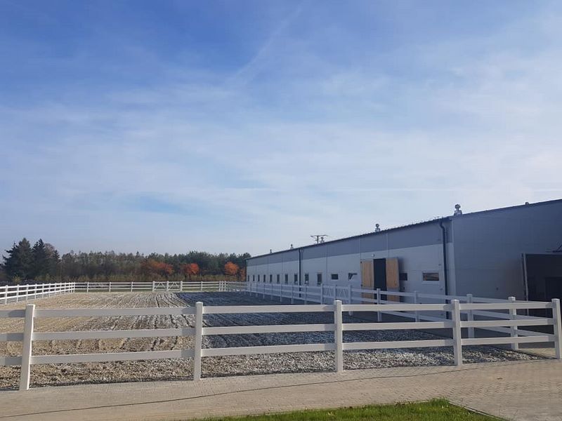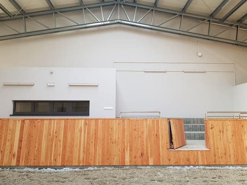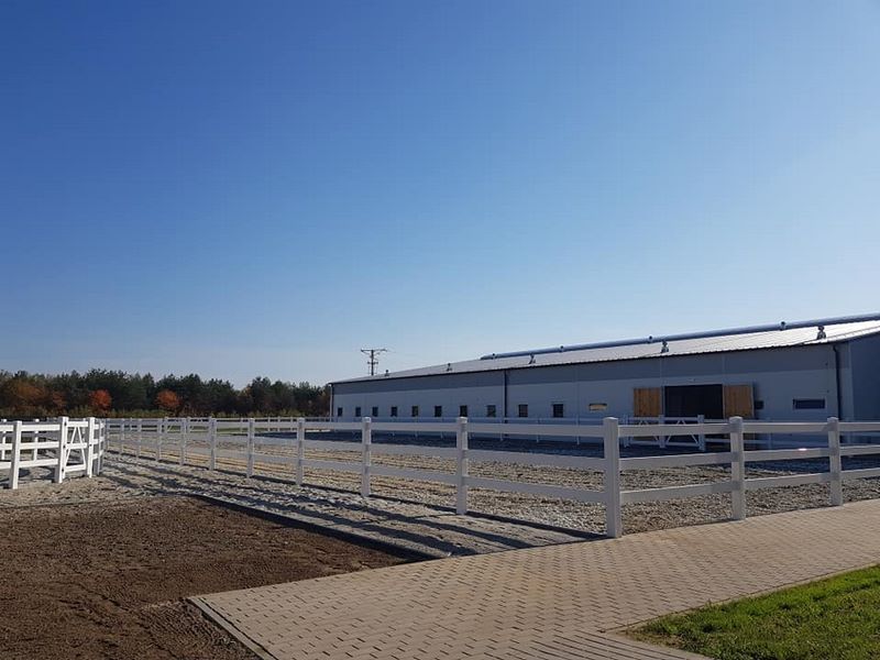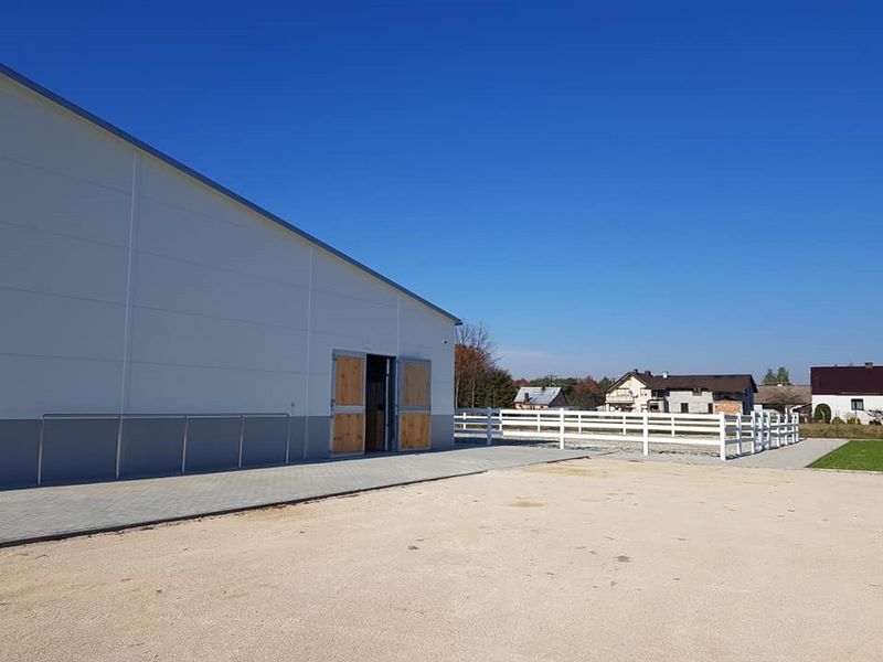 Nowy obiekt dysponuje wymiarową halą (20m x 40m) z profesjonalnym podłożem i bandą. Są to bardzo bezpieczne warunki zarówno dla jeźdźców, koni, jak i osób chodzących przy koniach. Warto zaznaczyć, że wymiary ujeżdżalni są takie same jak na zawodach Olimpiad Specjalnych. Naszym zawodnikom będzie więc łatwiej przygotować się do konkursów. Dodatkowo przy hali będzie widownia do oglądania zajęć, bezpiecznie oddzielona od placu do jazdy. Hala z 2 stron otoczona jest zabudowaniami a z trzeciej strony wiatą – daje to gwarancje lepszej izolacji i bardziej sprzyjających temperatur podczas mroźnej zimy i upalnego lata. Jest to szczególnie istotne dla najmłodszych uczestników hipoterapii. Oczywiście stajnia będzie dostosowana również do potrzeb osób na wózkach.