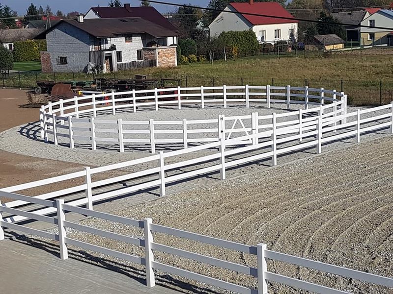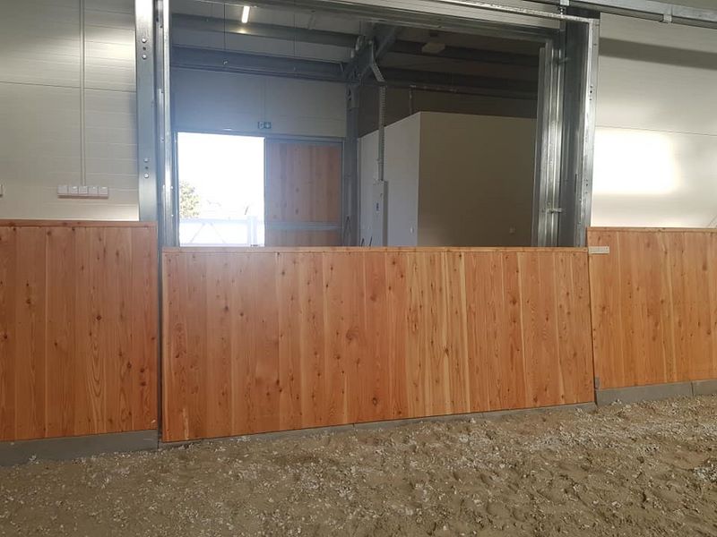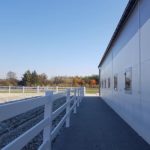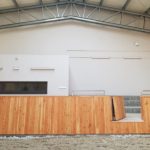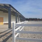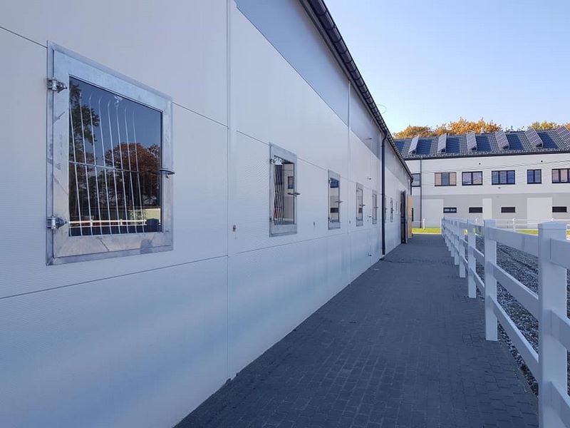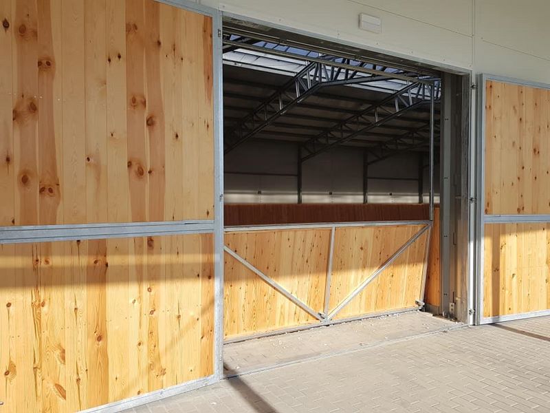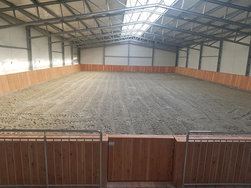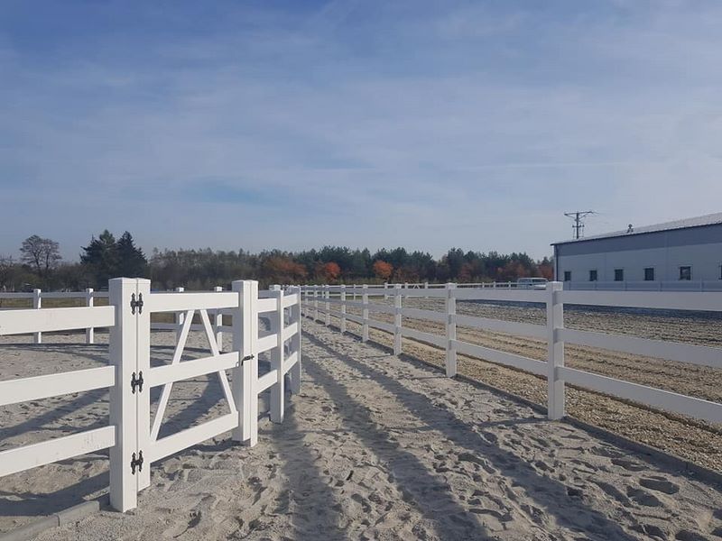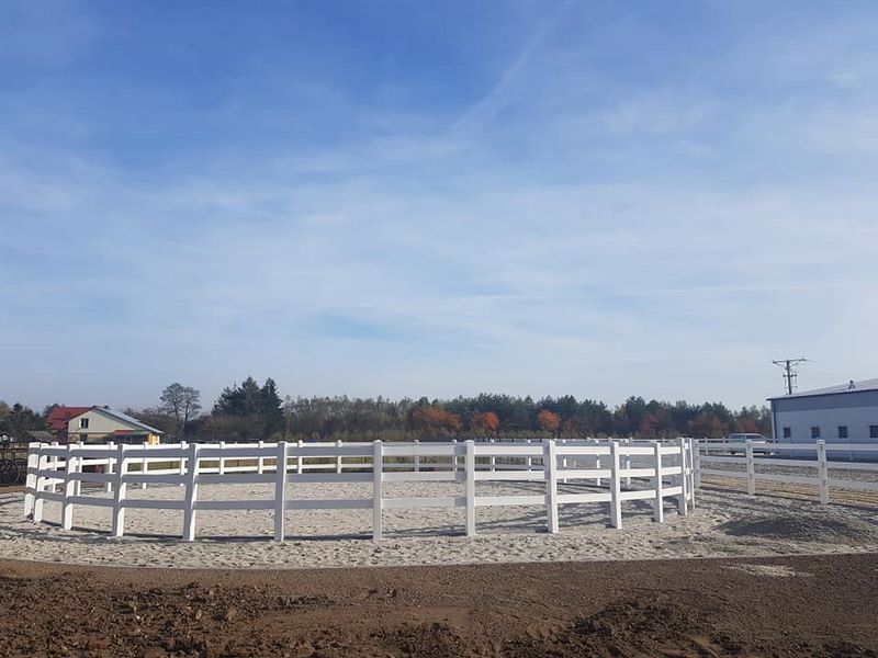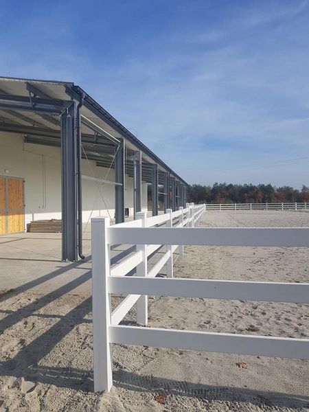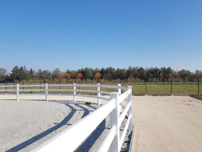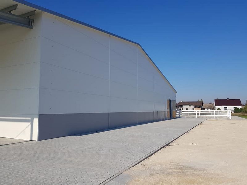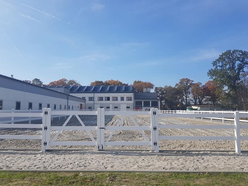 Nowy obiekt dysponuje wymiarową halą (20m x 40m) z profesjonalnym podłożem i bandą. Są to bardzo bezpieczne warunki zarówno dla jeźdźców, koni, jak i osób chodzących przy koniach. Warto zaznaczyć, że wymiary ujeżdżalni są takie same jak na zawodach Olimpiad Specjalnych. Naszym zawodnikom będzie więc łatwiej przygotować się do konkursów. Dodatkowo przy hali będzie widownia do oglądania zajęć, bezpiecznie oddzielona od placu do jazdy. Hala z 2 stron otoczona jest zabudowaniami a z trzeciej strony wiatą – daje to gwarancje lepszej izolacji i bardziej sprzyjających temperatur podczas mroźnej zimy i upalnego lata. Jest to szczególnie istotne dla najmłodszych uczestników hipoterapii. Oczywiście stajnia będzie dostosowana również do potrzeb osób na wózkach.