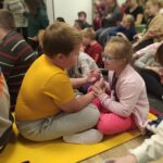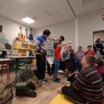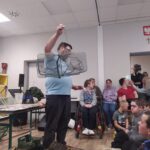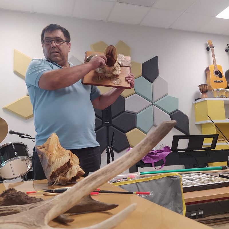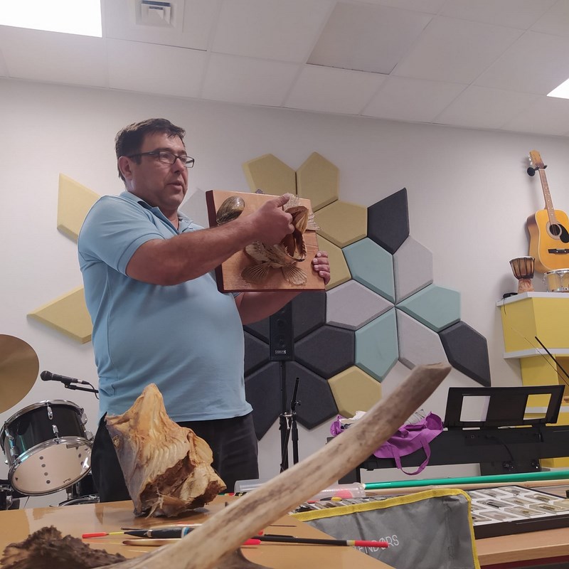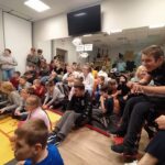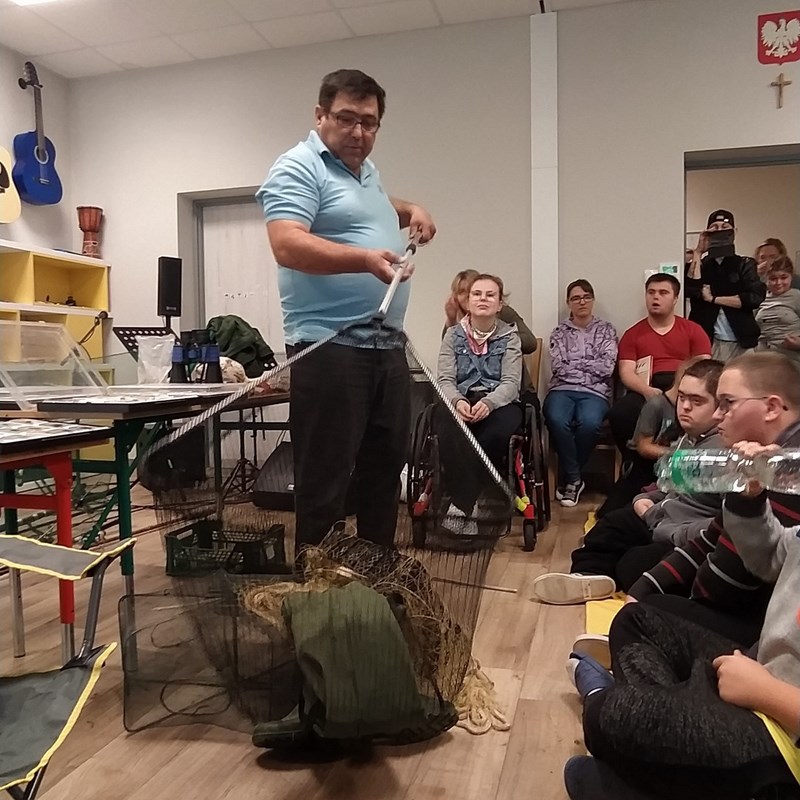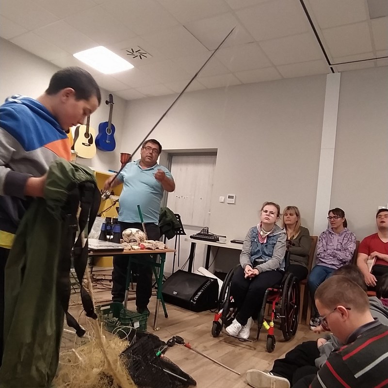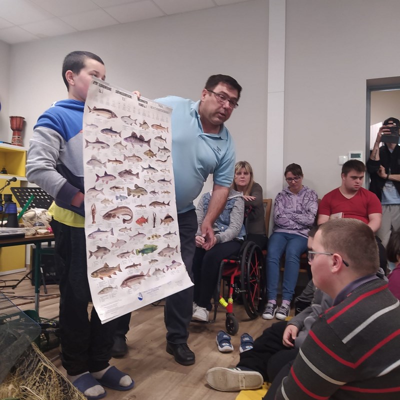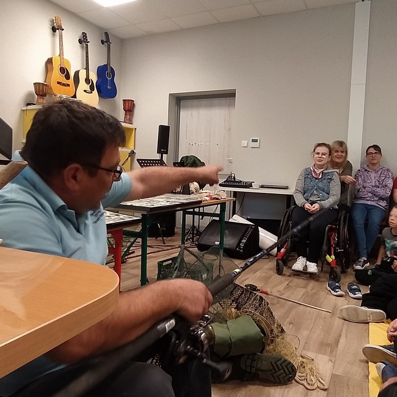 Zapoznał dzieci ze specyfiką sportu wędkarskiego oraz przedstawił wybrane gatunki ryb i określił środowisko ich życia. Wędkarz zaprezentował sprzęt i rekwizyty do łowienia ryb. Dzieci miały okazję dotknąć wędek, przeróżne przynęty, haczyki, spławiki, a nawet przymierzyć wodery, co wywołało dużo śmiechu. Mogły się przekonać ile waży wędka oraz jak wyglądają przynęty.