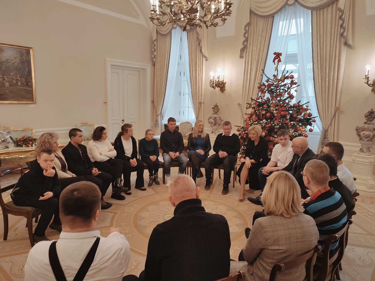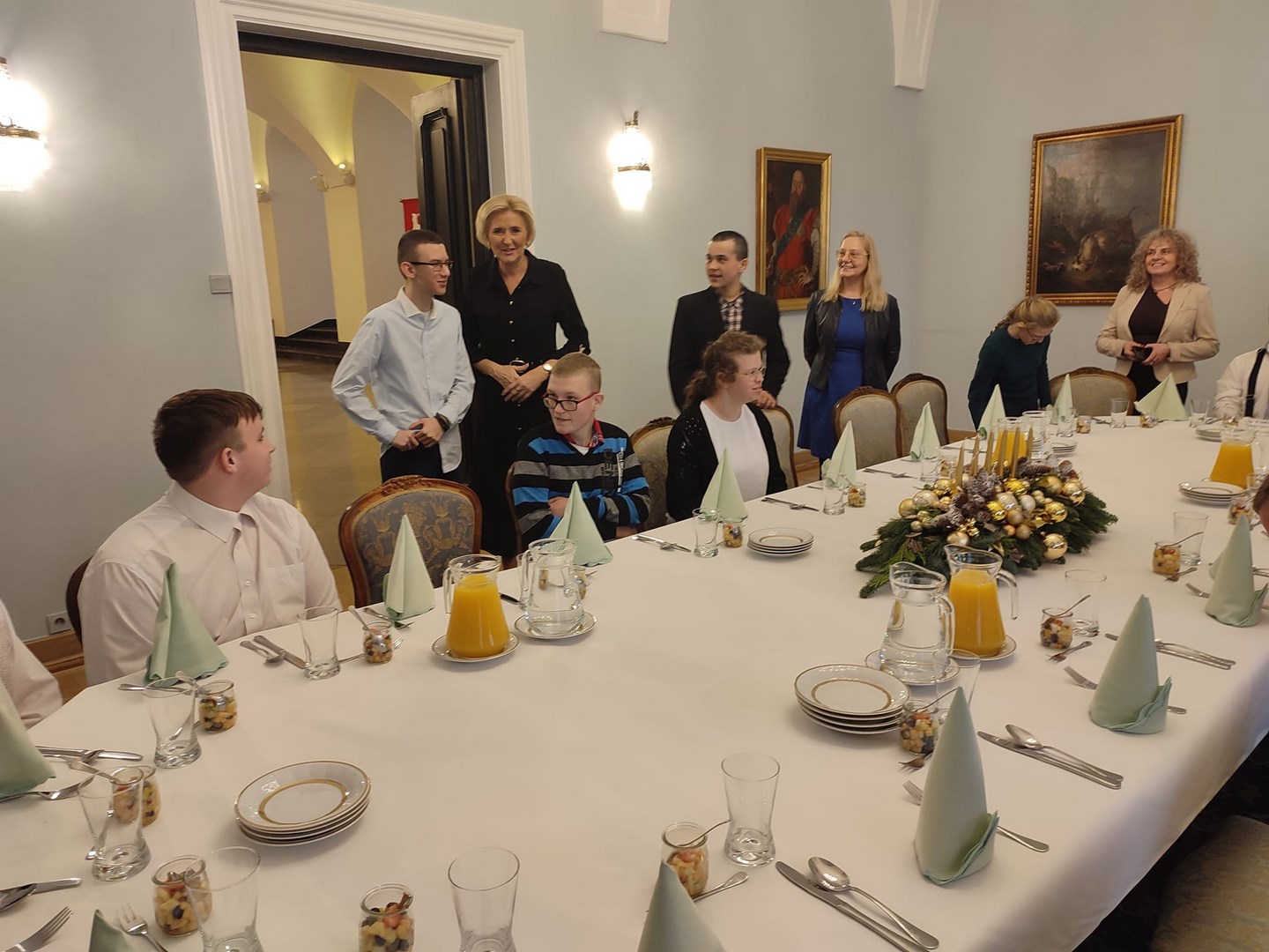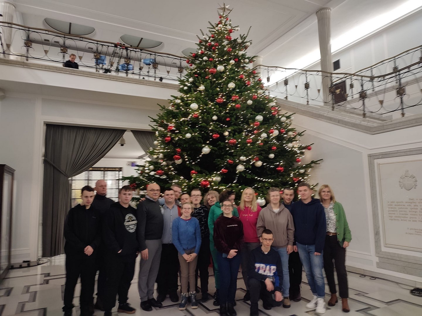 Grupa naszych starszych uczniów spędziła dwa dni w Warszawie. Wyjazd miał niecodzienny charakter, ponieważ reprezentanci społeczności Ośrodka udali się z rewizytą do Pałacu Prezydenckiego. Dwa lata temu Pierwsza Dama RP, Pani Agata Kornhauser-Duda odwiedziła naszą szkołę i zaprosiła nas do swojej warszawskiej rezydencji. Wyjazd został sfinalizowany dzięki pomocy Starosty Tarnowskiego Pana Jacka Hudymy i życzliwości Pana Ministra Piotra Ćwika. Nasi podopieczni zwiedzili Pałac Prezydencki i spotkali się z Panią Agata Kornhauser-Dudą.Spotkanie trwało ponad godzinę i miało bardzo rodzinny charakter. Pierwsza Dama nawiązując do wizyty na Dwudniakach pytała o projekty, wydarzenia, imprezy, które przez ostatnie dwa lata organizował Ośrodek. Nie zabrakło tematów związanych ze świętami, św. Mikołajem, tradycjami świątecznymi. Ogromnym zaskoczeniem dla wszystkich było zaproszenie całej grupy na obiad, który został podany w pomieszczeniu w którym Pan Prezydent podejmuje swoich oficjalnych gości posiłkami. Udało się także wymienić pozdrowienia z Panem Prezydentem Andrzejem Dudą, który spotkał się z wychowankami na korytarzu pałacu udając się do swoich prezydenckich obowiązków. Naszym obieżyświatom udało się również zwiedzić pomieszczenia Sejmu RP za co szczególnie pragną podziękować Pani Poseł Józefie Szczurek-Żelazko ,która zatroszczyła się o ustalenie optymalnego terminu zwiedzania. Udało się także znaleźć czas na podziwianie świątecznych iluminacji warszawskiej starówki. Wczoraj wieczorem, pełni niezapomnianych wrażeń, bezpiecznie wrócili do Ośrodka. Dziękujemy Stowarzyszeniu Prometeusz za finansowe wsparcie wjazdu.