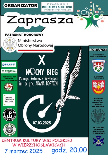 Stowarzyszenie Inicjatywy Społeczne w Wierzchosławicach serdecznie zaprasza na X NOCNY BIEG PAMIĘCI ŻOŁNIERZY WYKLĘTYCH IM. CC PŁK. ADAMA BORYCZKI” w dniu 07.03.2025 r. Szczegóły na plakacie: